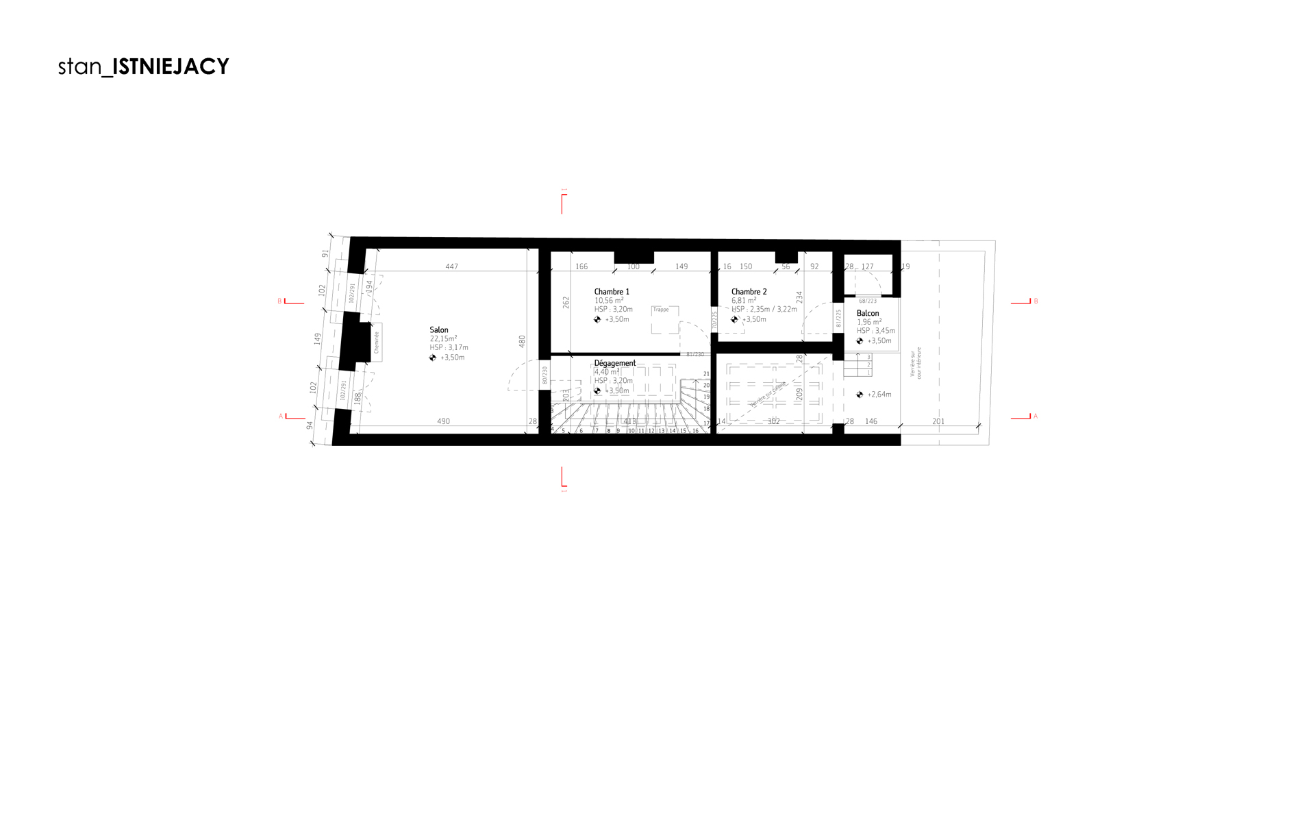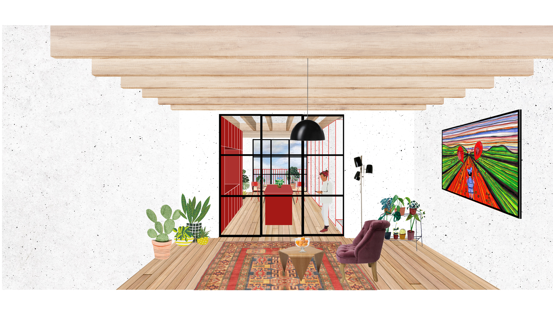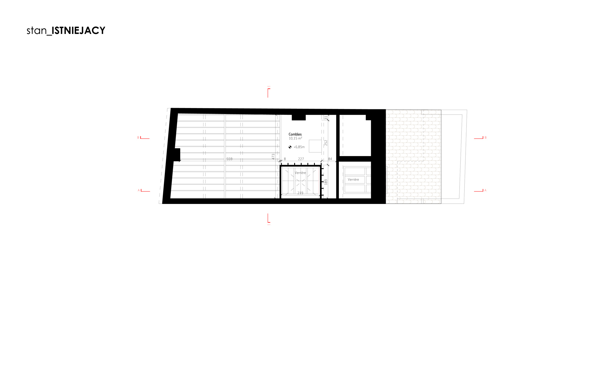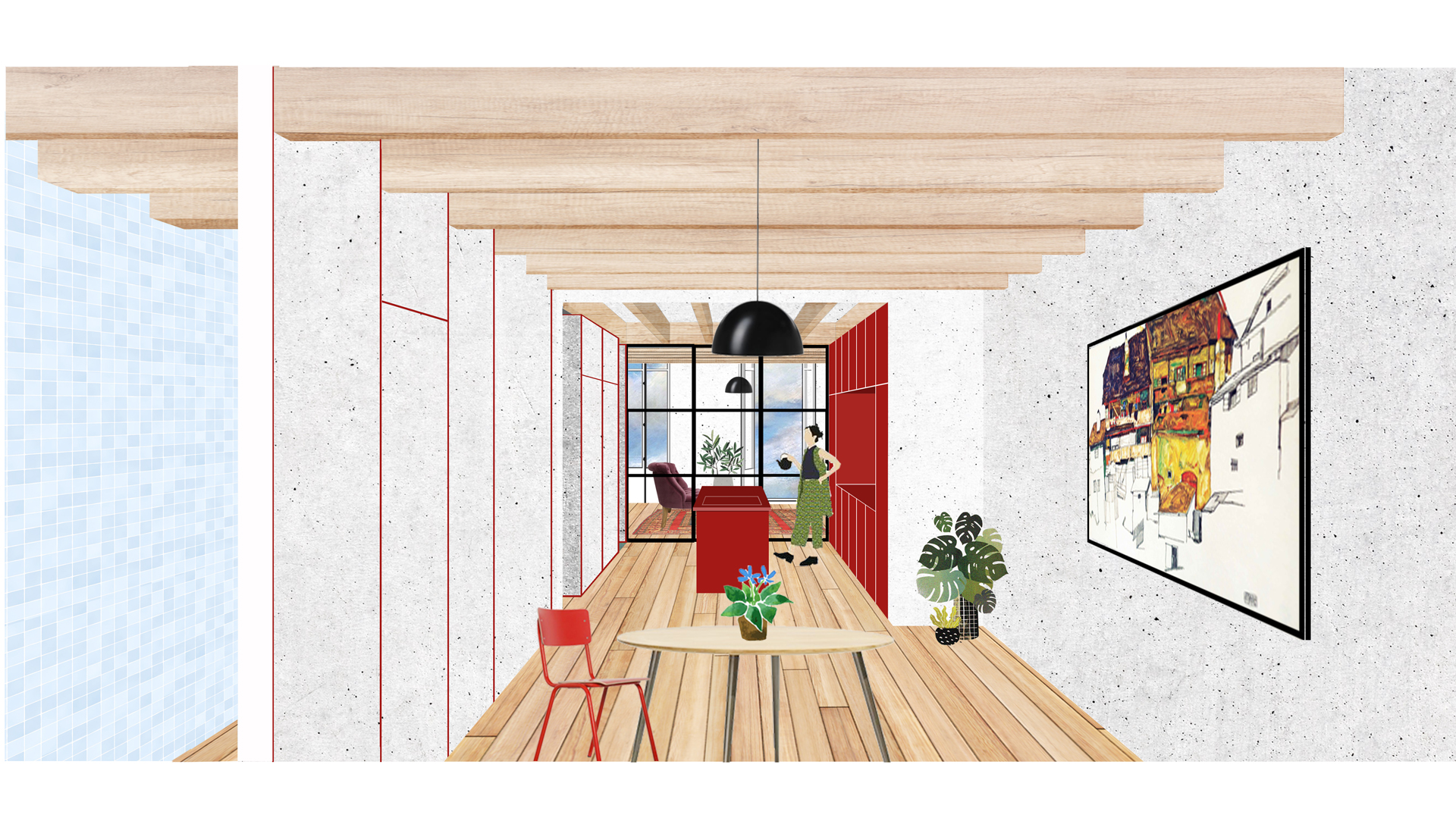Poziom +1, który stanowił do tej pory całość powierzchni użytkowej został uwolniony od podziałów i ścian. Strefę sypialni przenieśliśmy do nowo urządzonego poddasza (+2), dzięki czemu uzyskując otwartą przestrzeń całej kondygnacji głównej (+1). Jednolita powierzchnia została wyposażona w 3 funkcje: kuchnie, jadalnie z dostępem do szerokiego balkonu oraz salonu. Podział tych stref wyznacza jedynie konstrukcja stropu. Kierunek belek definiuje granice, brak jest ścian oraz podziałów w posadzce, dzięki czemu przestrzeń jest płynna.