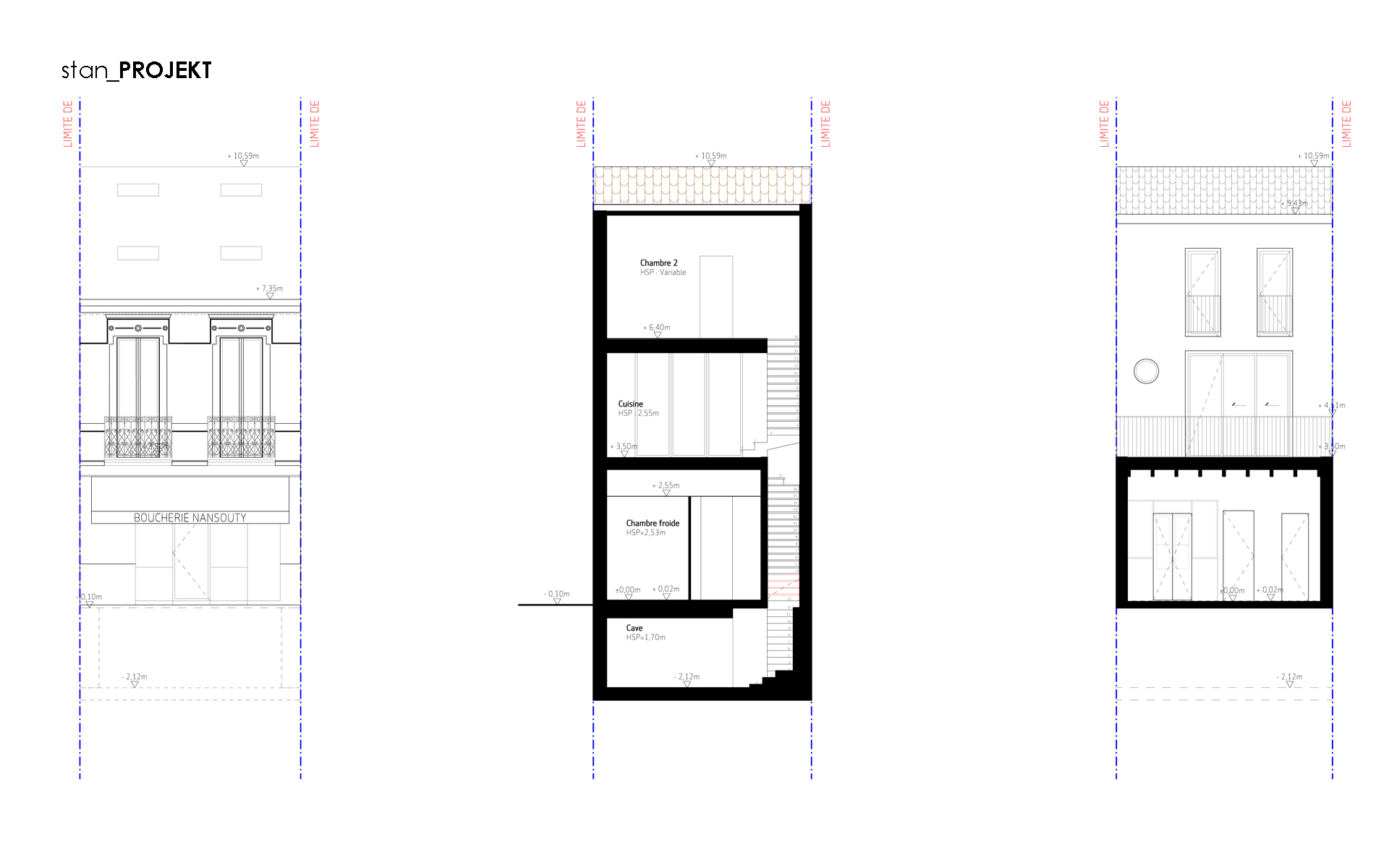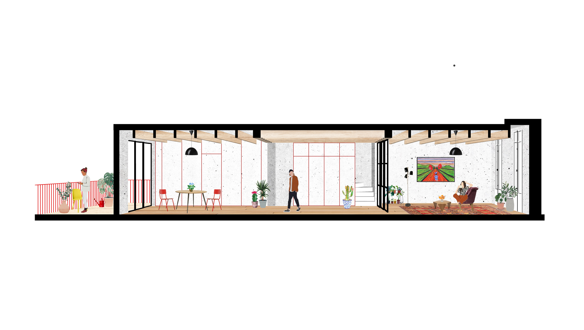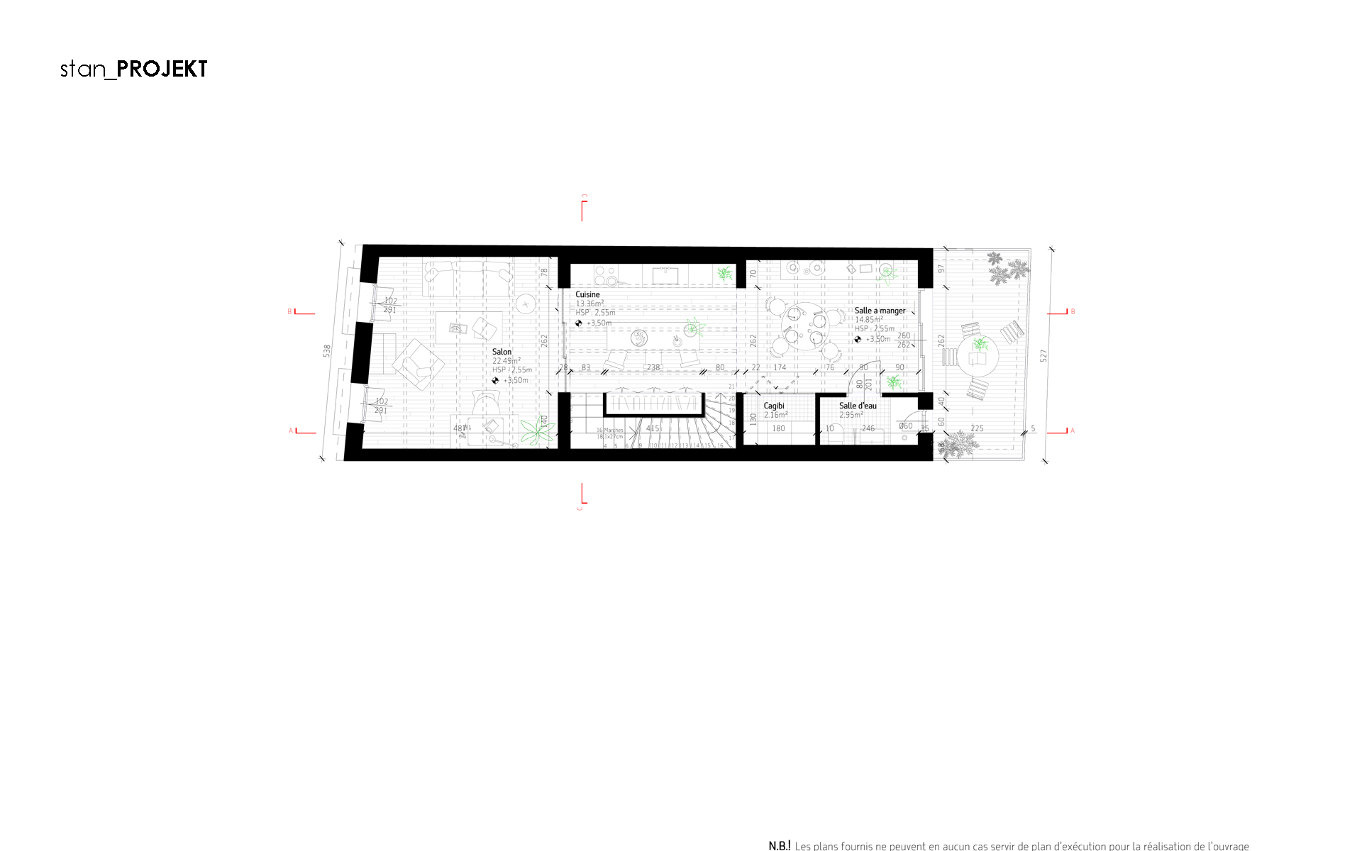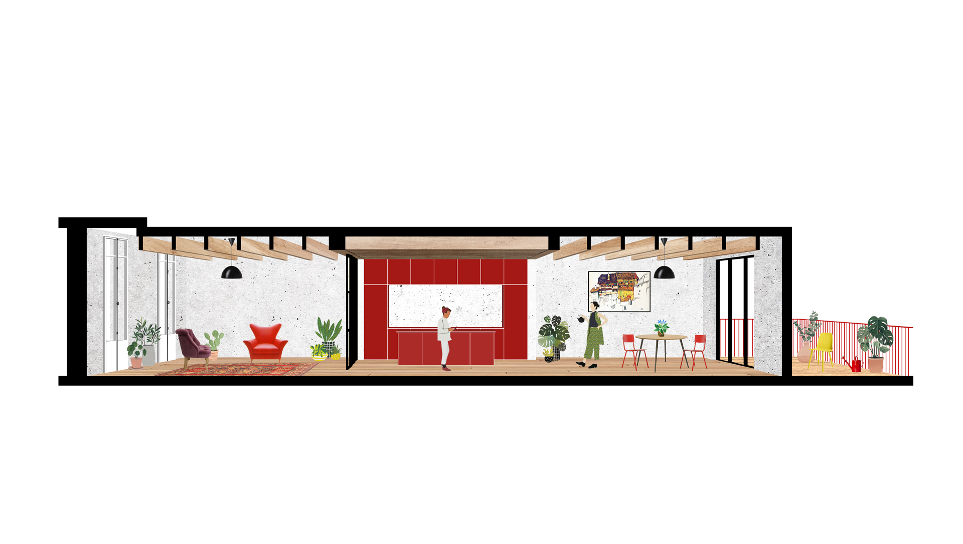 Poziom +1, który stanowił do tej pory całość powierzchni użytkowej został uwolniony od podziałów i ścian. Strefę sypialni przenieśliśmy do nowo urządzonego poddasza (+2), dzięki czemu uzyskując otwartą przestrzeń całej kondygnacji głównej (+1). Jednolita powierzchnia została wyposażona w 3 funkcje: kuchnie, jadalnie z dostępem do szerokiego balkonu oraz salonu. Podział tych stref wyznacza jedynie konstrukcja stropu. Kierunek belek definiuje granice, brak jest ścian oraz podziałów w posadzce, dzięki czemu przestrzeń jest płynna.