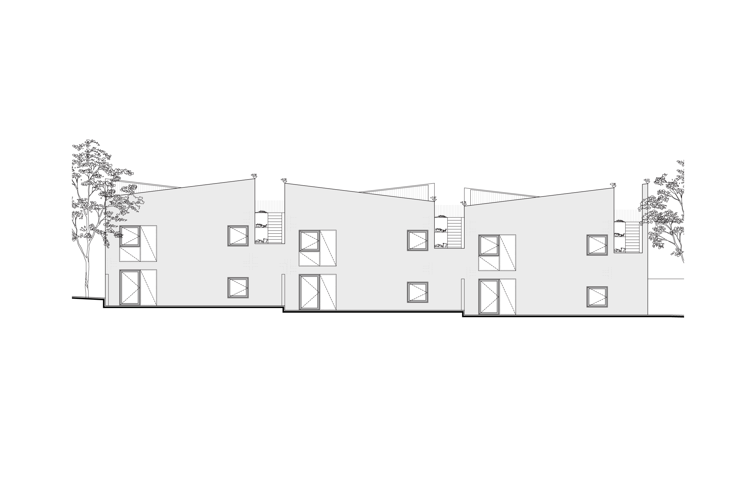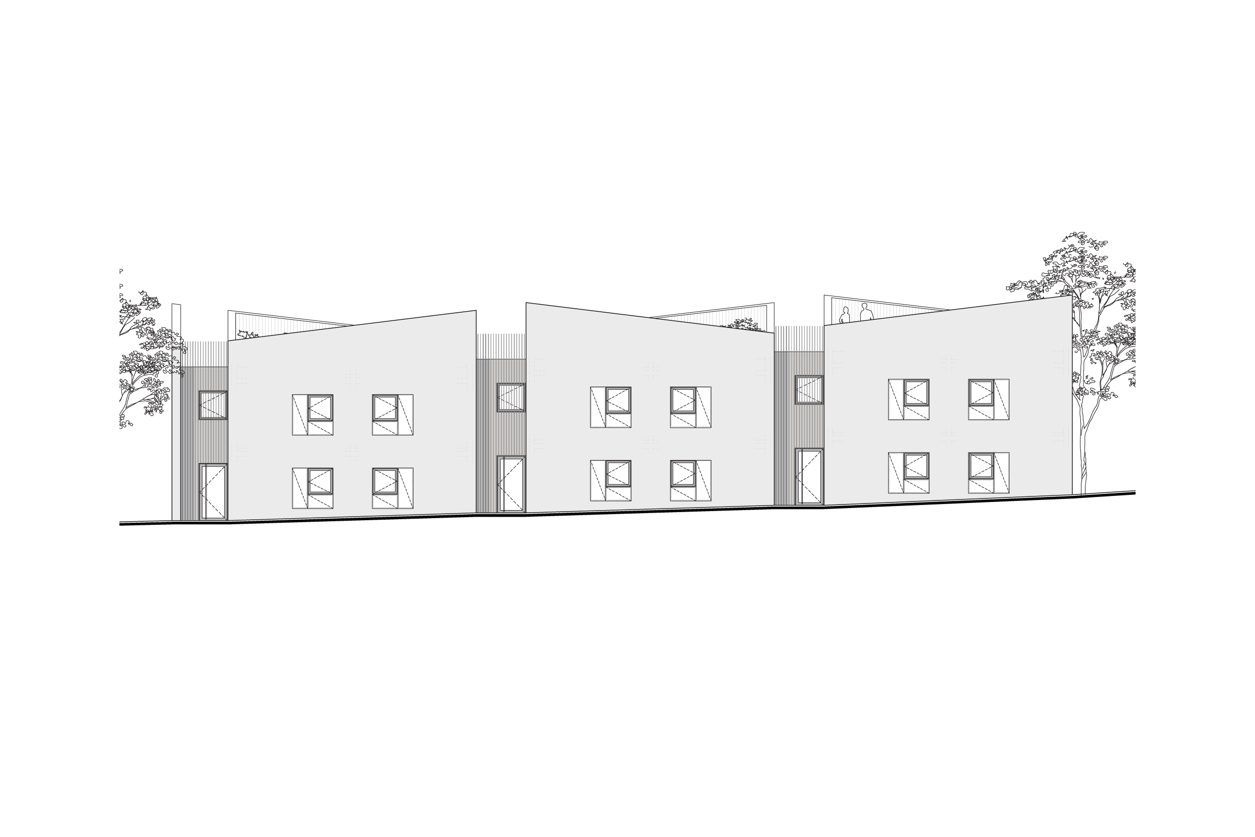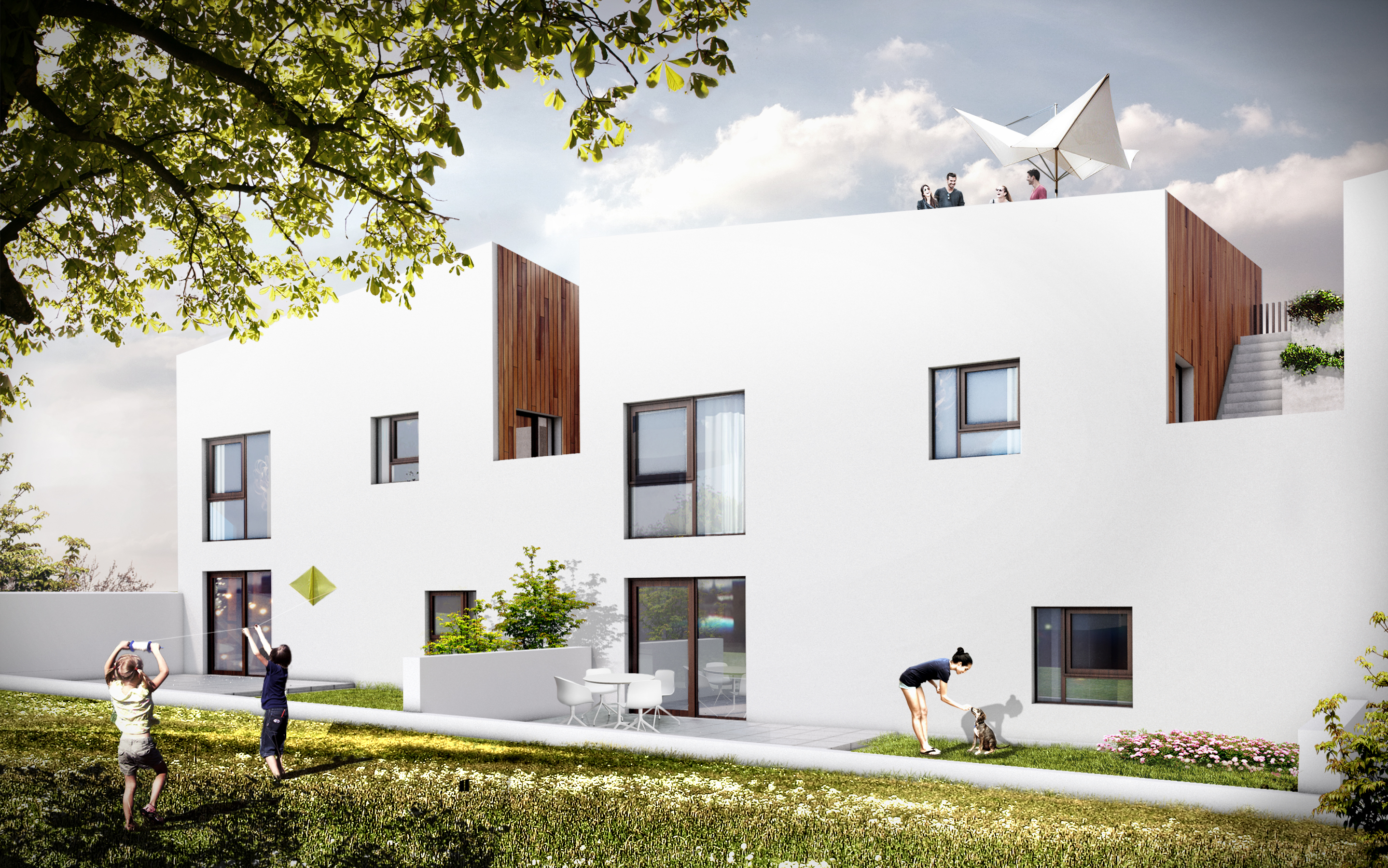 Odwiedziliśmy działkę w słoneczna pogodę, było widać góry, zależało nam by nie utracić tego widoku. To on zdeterminował idee projektu – dolne mieszkanie z ogródkiem przy domu oraz górne z tarasem zielonym na dachu. W procesie projektowania powstały nieregularne attyki, które nie tylko nadają bryle dynamiki, ale których zadaniem jest zapewnienie intymności i prywatności oraz ochrona przed wiatrem i słońcem.