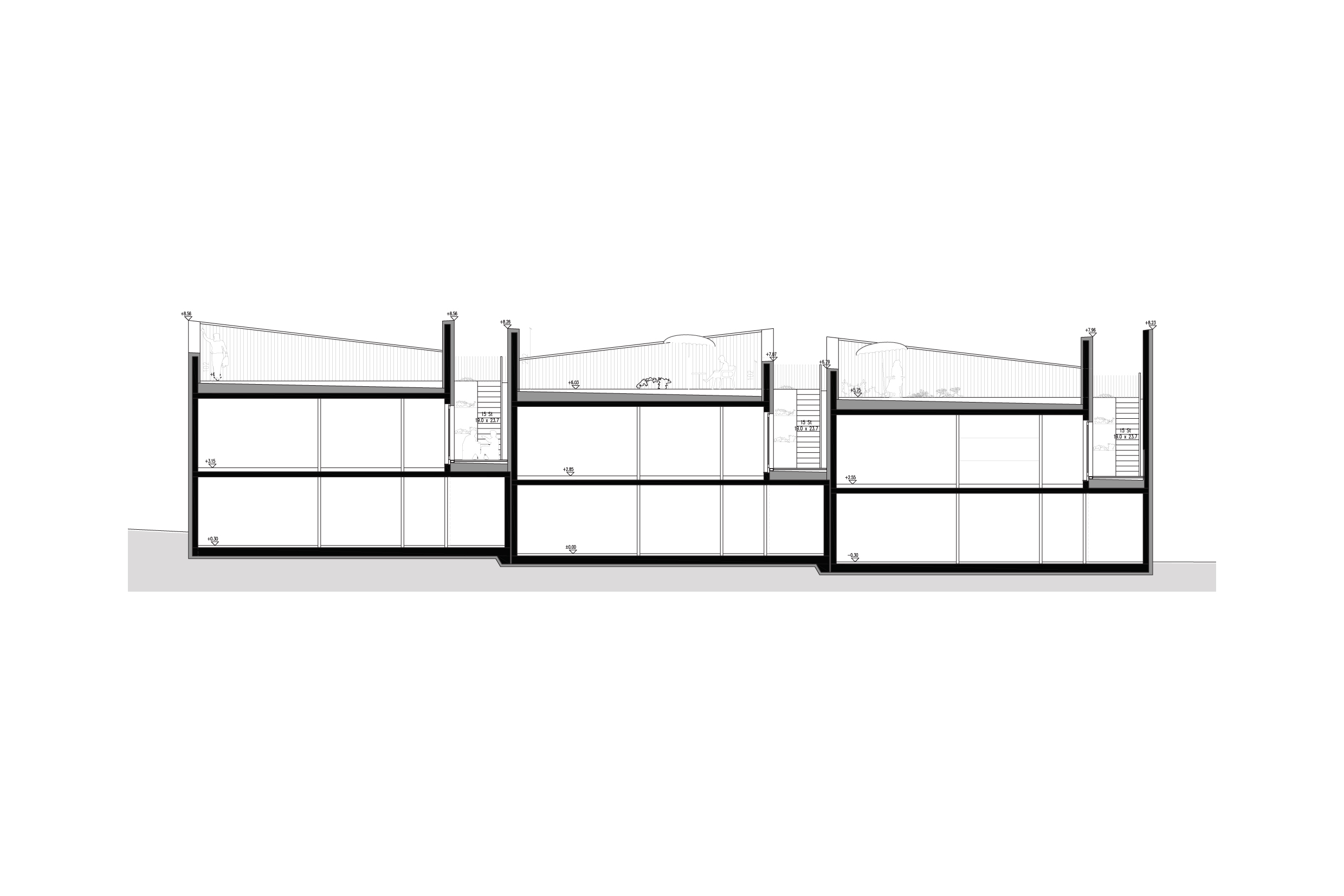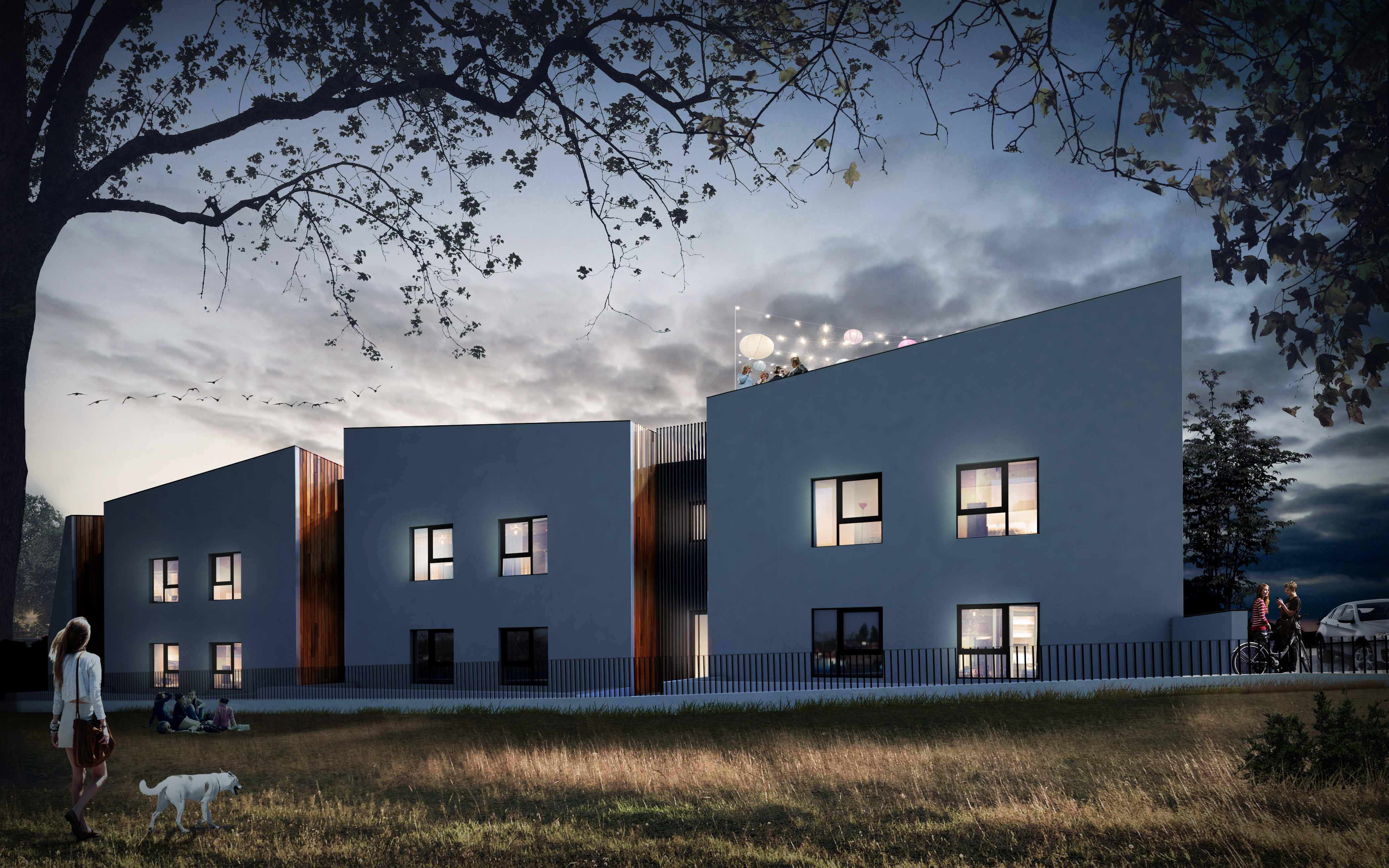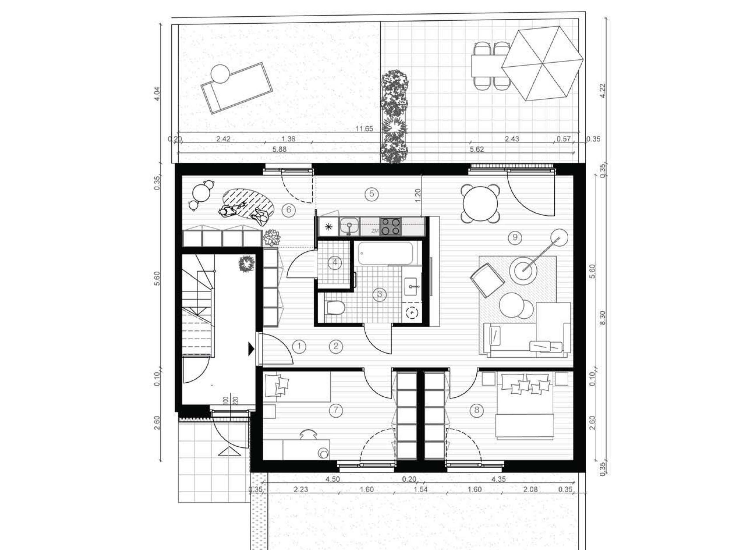 Odwiedziliśmy działkę w słoneczna pogodę, było widać góry, zależało nam by nie utracić tego widoku. To on zdeterminował idee projektu – dolne mieszkanie z ogródkiem przy domu oraz górne z tarasem zielonym na dachu. W procesie projektowania powstały nieregularne attyki, które nie tylko nadają bryle dynamiki, ale których zadaniem jest zapewnienie intymności i prywatności oraz ochrona przed wiatrem i słońcem.
