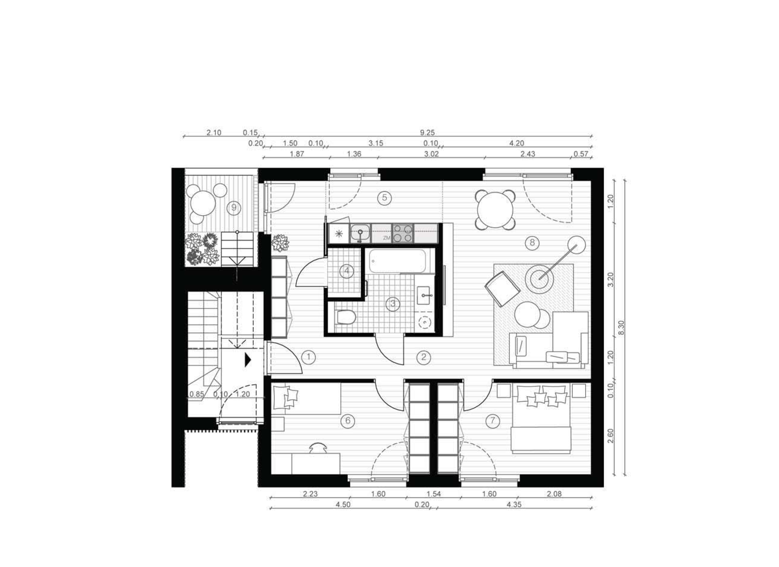 Rzut mieszkania został tak rozwiązany, aby umożliwić maksymalną penetrację przez światło. Nie ma ciemnych kątów, wchodząc do mieszkania, wchodzimy od razu do jasnego pomieszczenia a otwarty plan daje wrażenie większej przestrzeni.