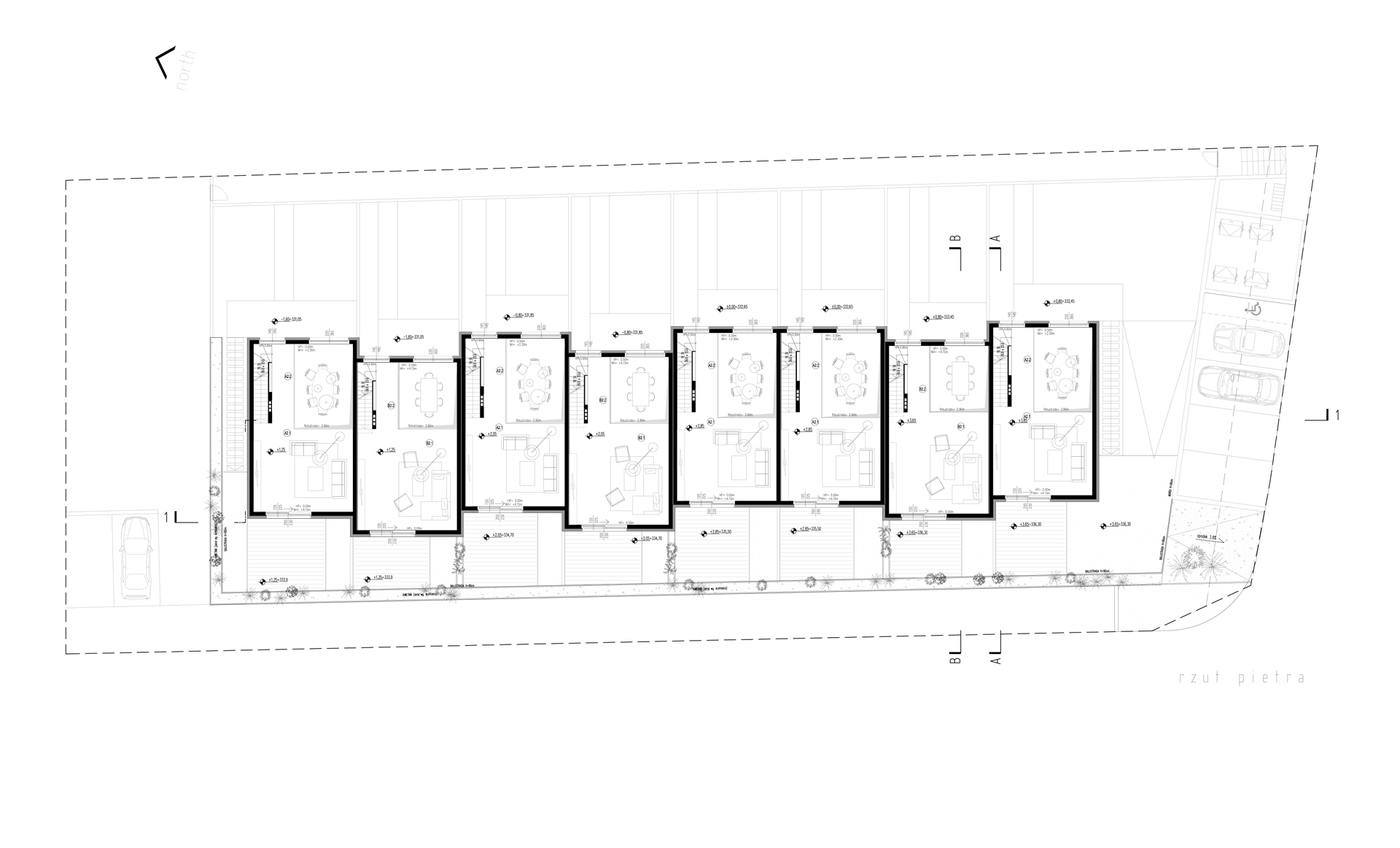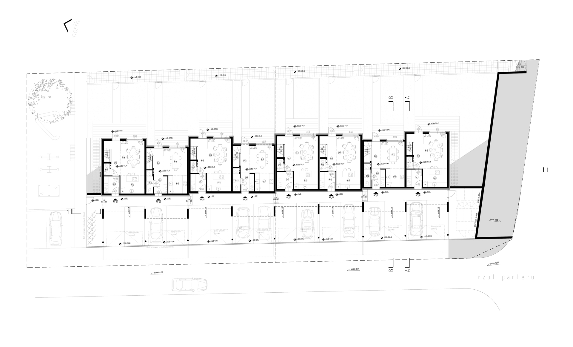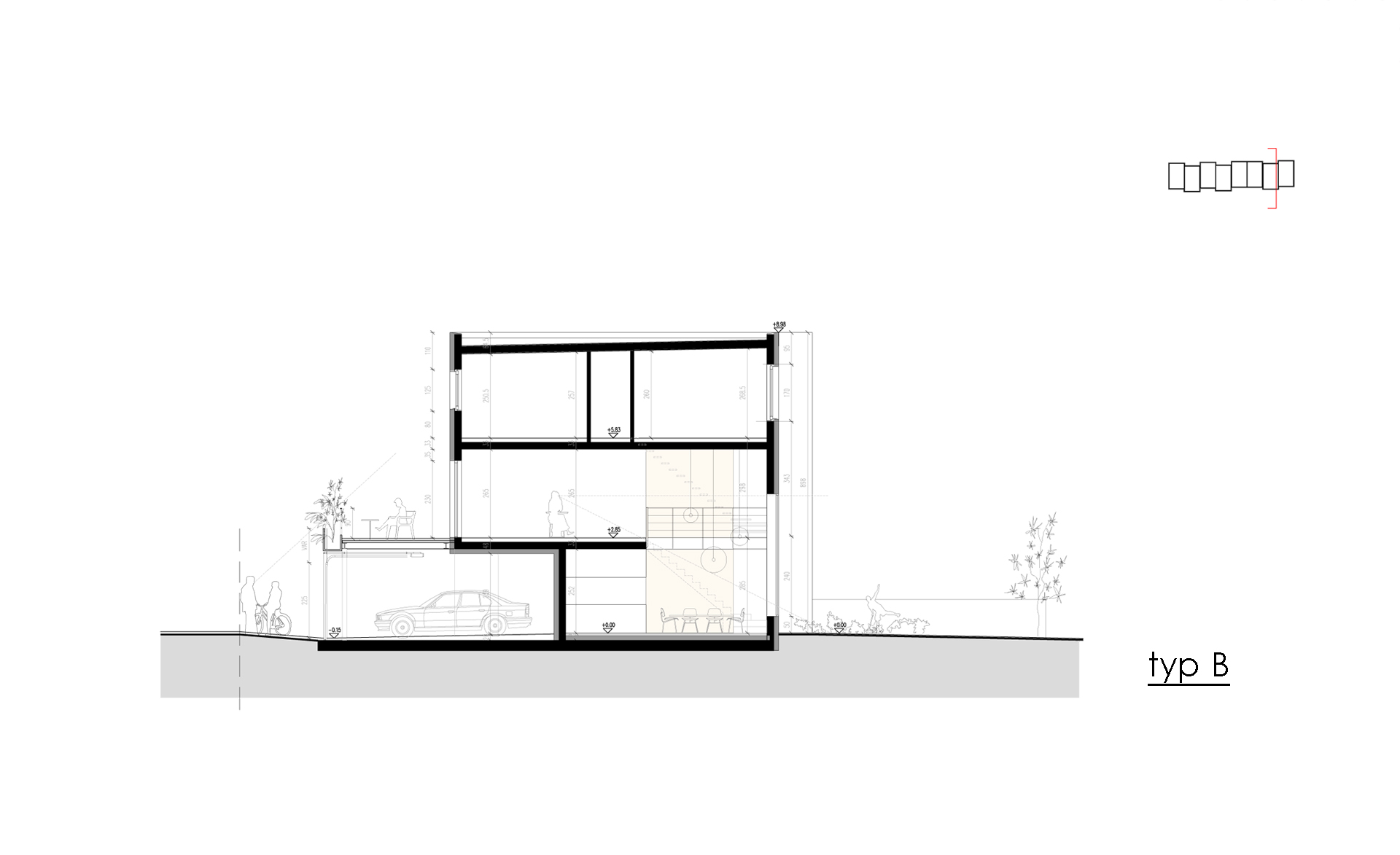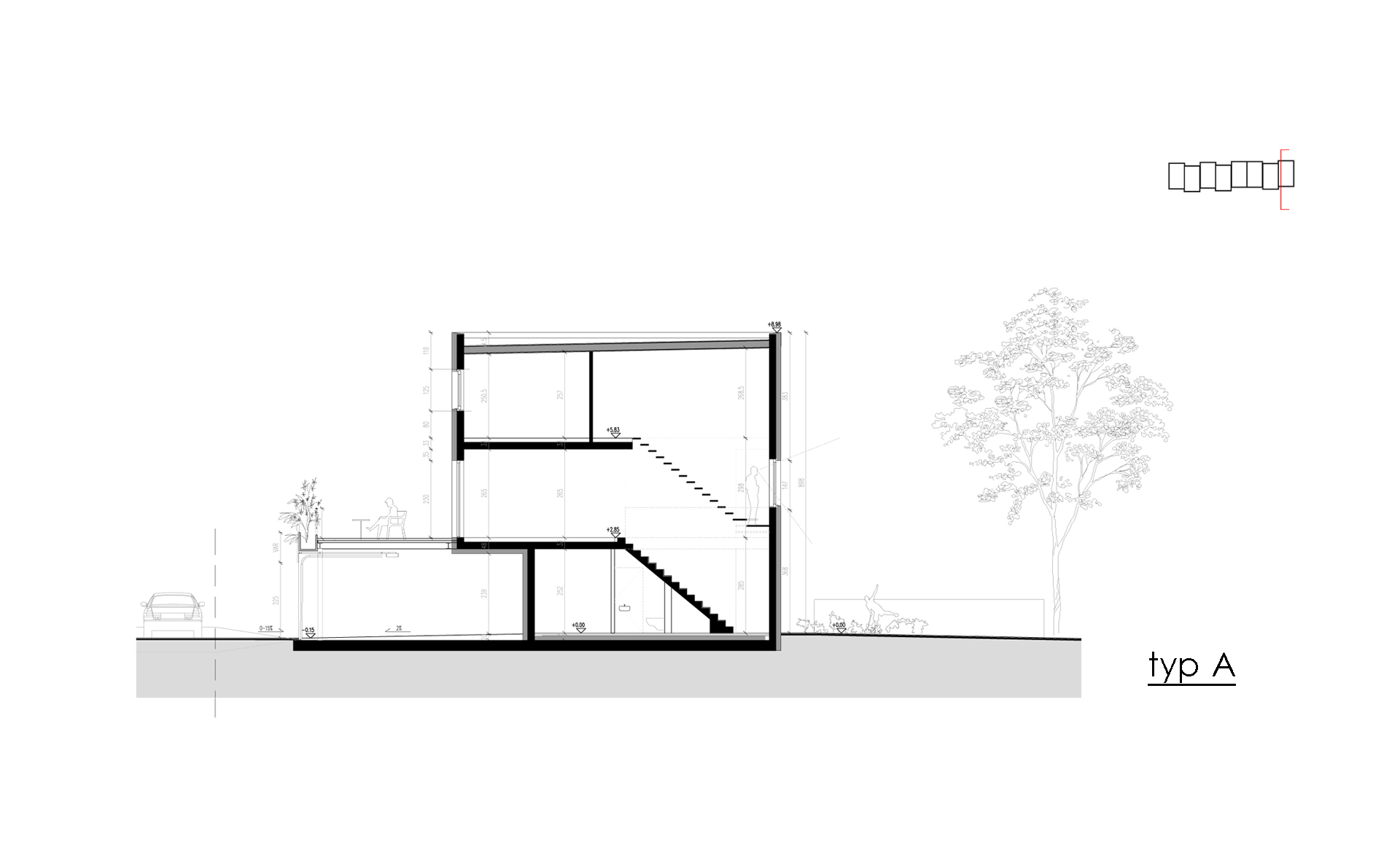 Pomysł na projekt przychodzi często z próby rozwiązania problemu jaki stawia lokalizacja. Działka Nowy Świat oferuje wjazd od strony pd-zach. Stworzenie zabudowy szeregowej z “parkowiskiem” od strony najbardziej nasłonecznionej nie jest rozwiązaniem akceptowalnym. Przykryliśmy parking pasem zielonych tarasów dostępnych z pokoju dziennego na poziomie +1. Poziom 0 zajmuje kuchnia z jadalnią otwartą na dwie kondygnacje, tak, że przestrzeni salony mamy do niej wglad. Umożliwia to dodatkowo penetrację dolnego poziomu przez światło zachodnie. Wysokie na 3,5m otwarcie okienne na parterze pozwala na obserwację ogrodu także z poziomu salonu. To przenikanie się obu kondygnacji definiuje projekt.