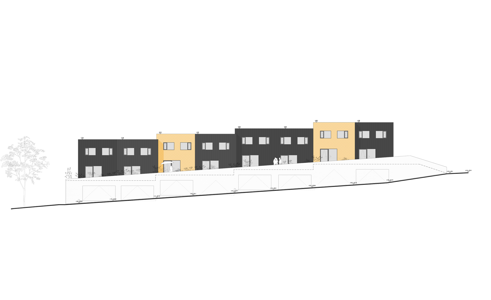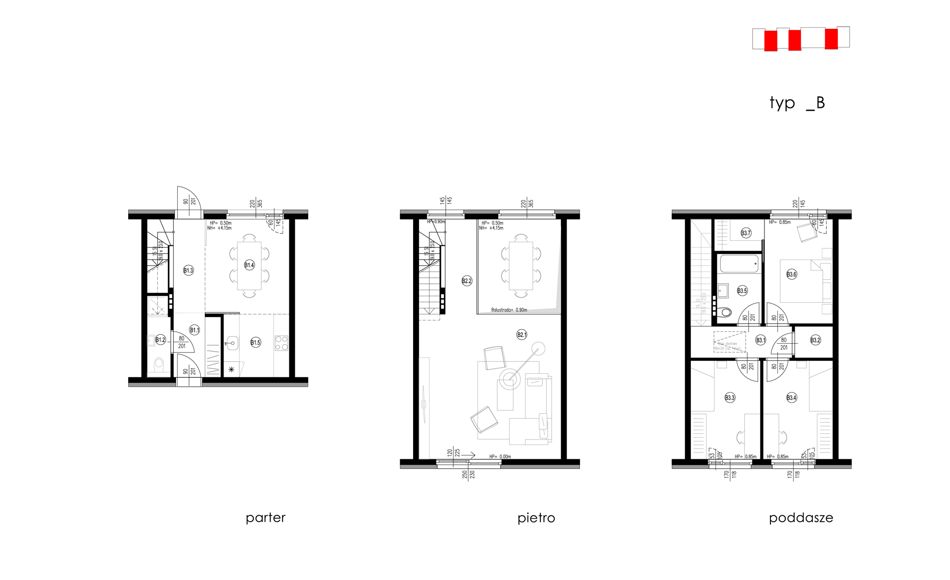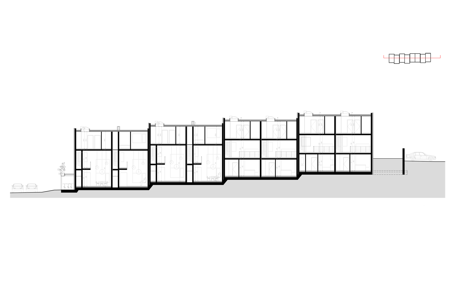 Pomysł na projekt przychodzi często z próby rozwiązania problemu jaki stawia lokalizacja. Działka Nowy Świat oferuje wjazd od strony pd-zach. Stworzenie zabudowy szeregowej z “parkowiskiem” od strony najbardziej nasłonecznionej nie jest rozwiązaniem akceptowalnym. Przykryliśmy parking pasem zielonych tarasów dostępnych z pokoju dziennego na poziomie +1. Poziom 0 zajmuje kuchnia z jadalnią otwartą na dwie kondygnacje, tak, że przestrzeni salony mamy do niej wglad. Umożliwia to dodatkowo penetrację dolnego poziomu przez światło zachodnie. Wysokie na 3,5m otwarcie okienne na parterze pozwala na obserwację ogrodu także z poziomu salonu. To przenikanie się obu kondygnacji definiuje projekt.