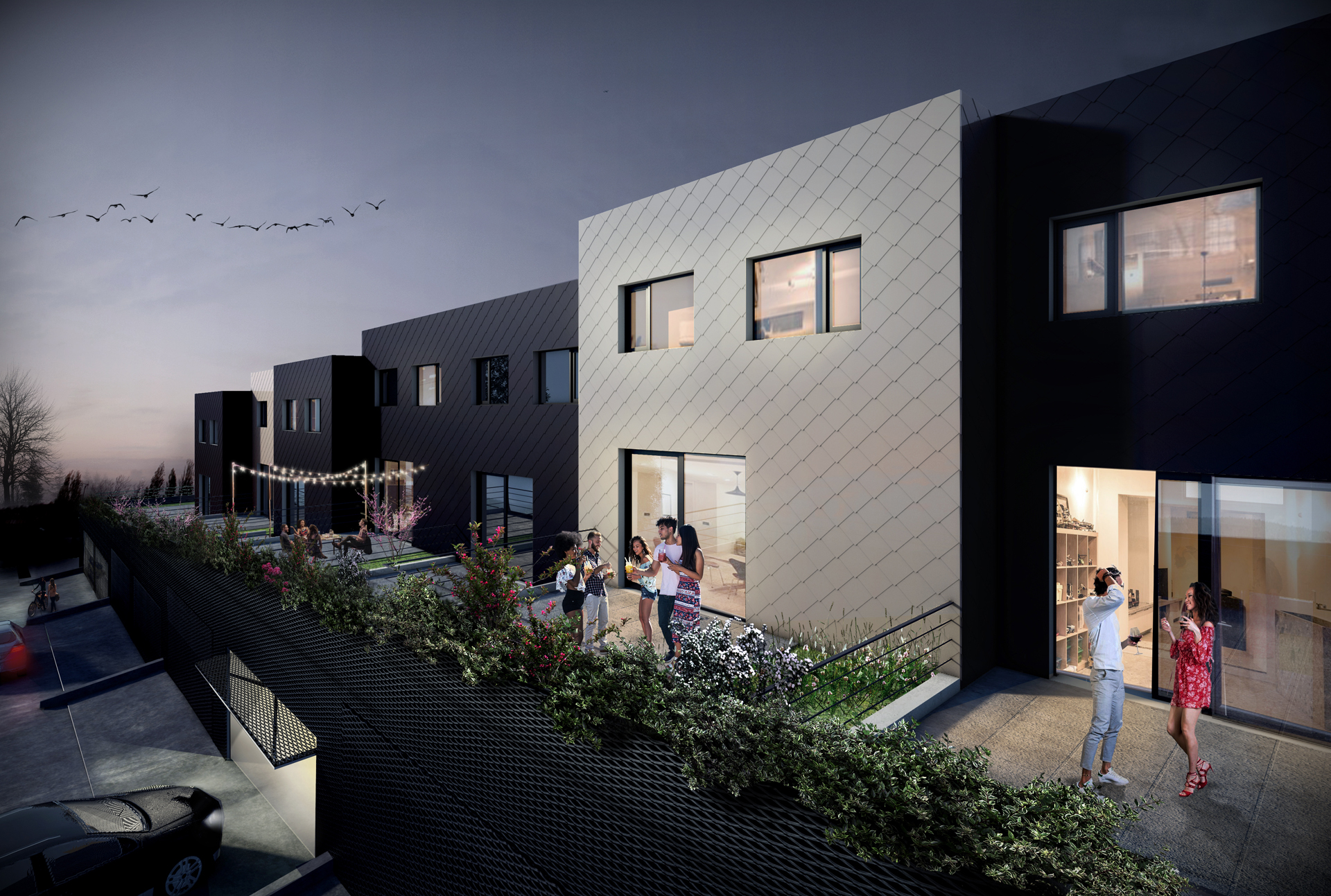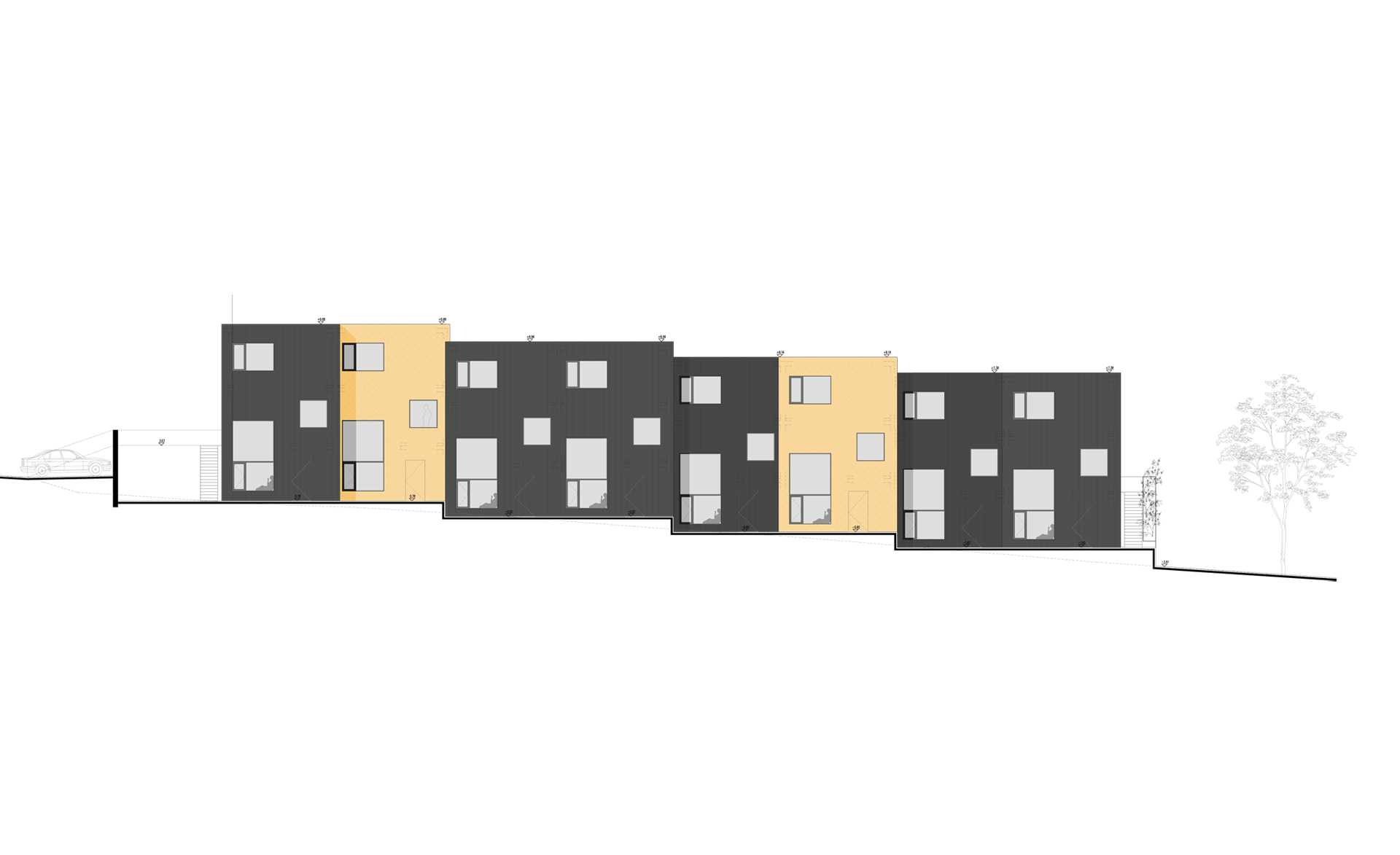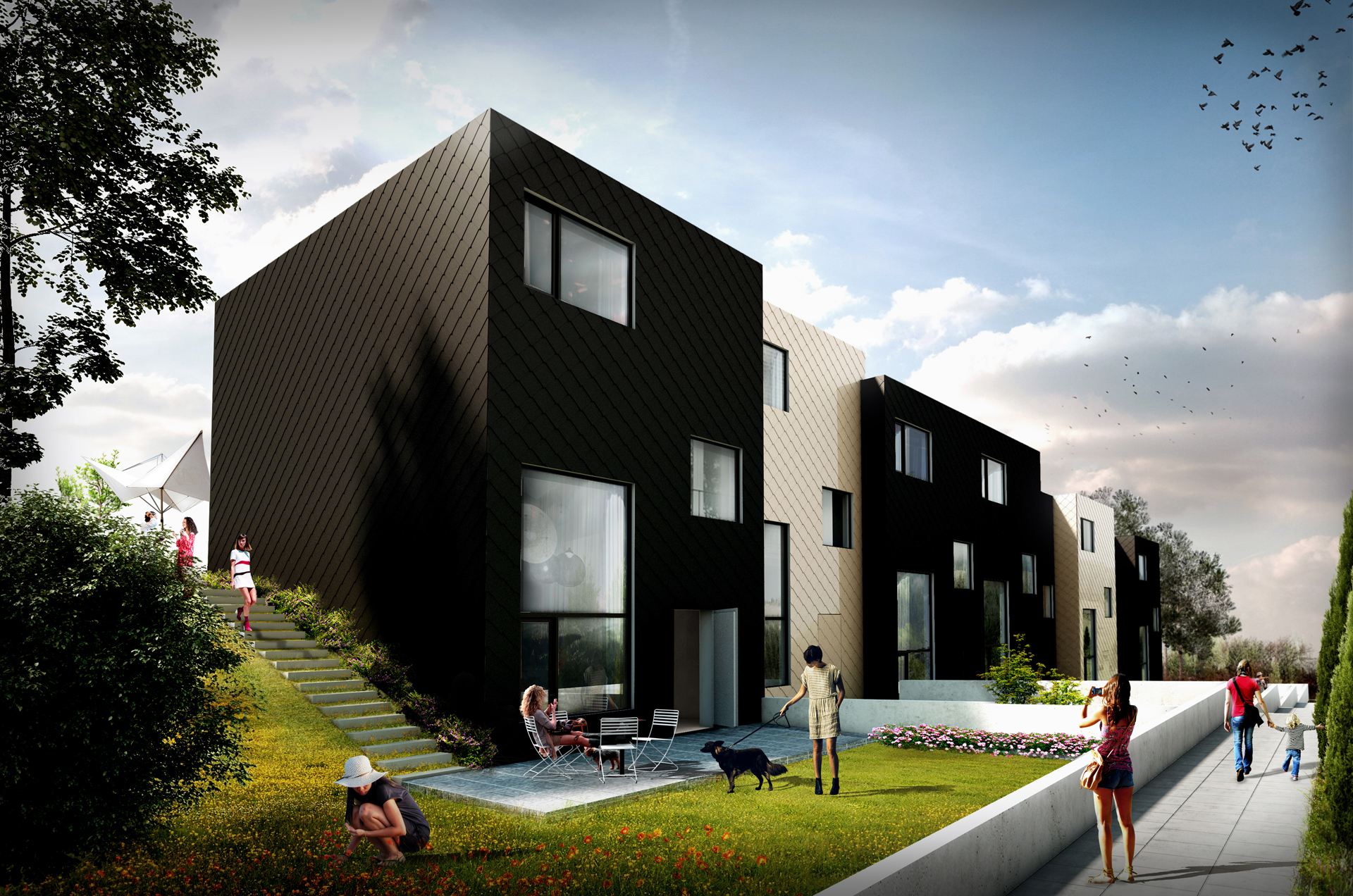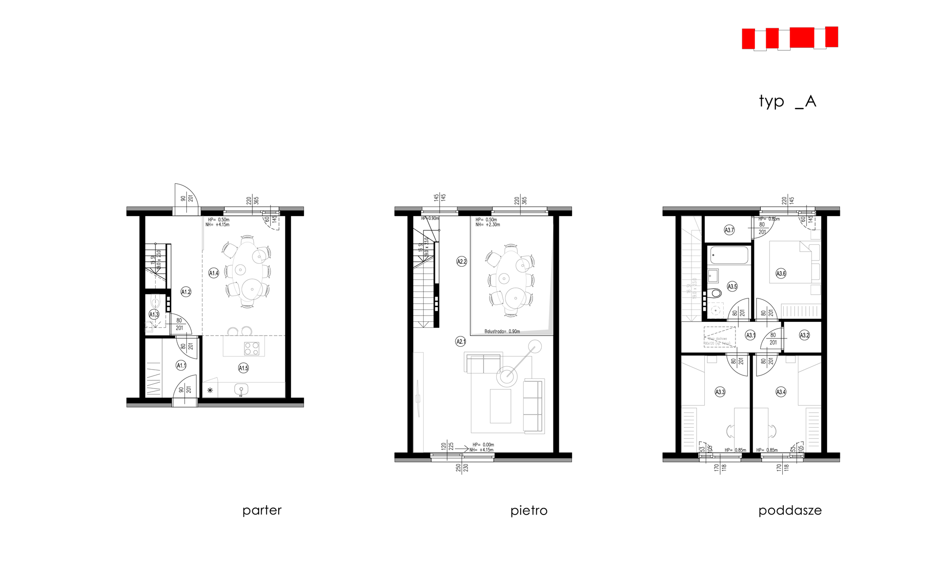 Pomysł na projekt przychodzi często z próby rozwiązania problemu jaki stawia lokalizacja. Działka Nowy Świat oferuje wjazd od strony pd-zach. Stworzenie zabudowy szeregowej z “parkowiskiem” od strony najbardziej nasłonecznionej nie jest rozwiązaniem akceptowalnym. Przykryliśmy parking pasem zielonych tarasów dostępnych z pokoju dziennego na poziomie +1. Poziom 0 zajmuje kuchnia z jadalnią otwartą na dwie kondygnacje, tak, że przestrzeni salony mamy do niej wglad. Umożliwia to dodatkowo penetrację dolnego poziomu przez światło zachodnie. Wysokie na 3,5m otwarcie okienne na parterze pozwala na obserwację ogrodu także z poziomu salonu. To przenikanie się obu kondygnacji definiuje projekt.