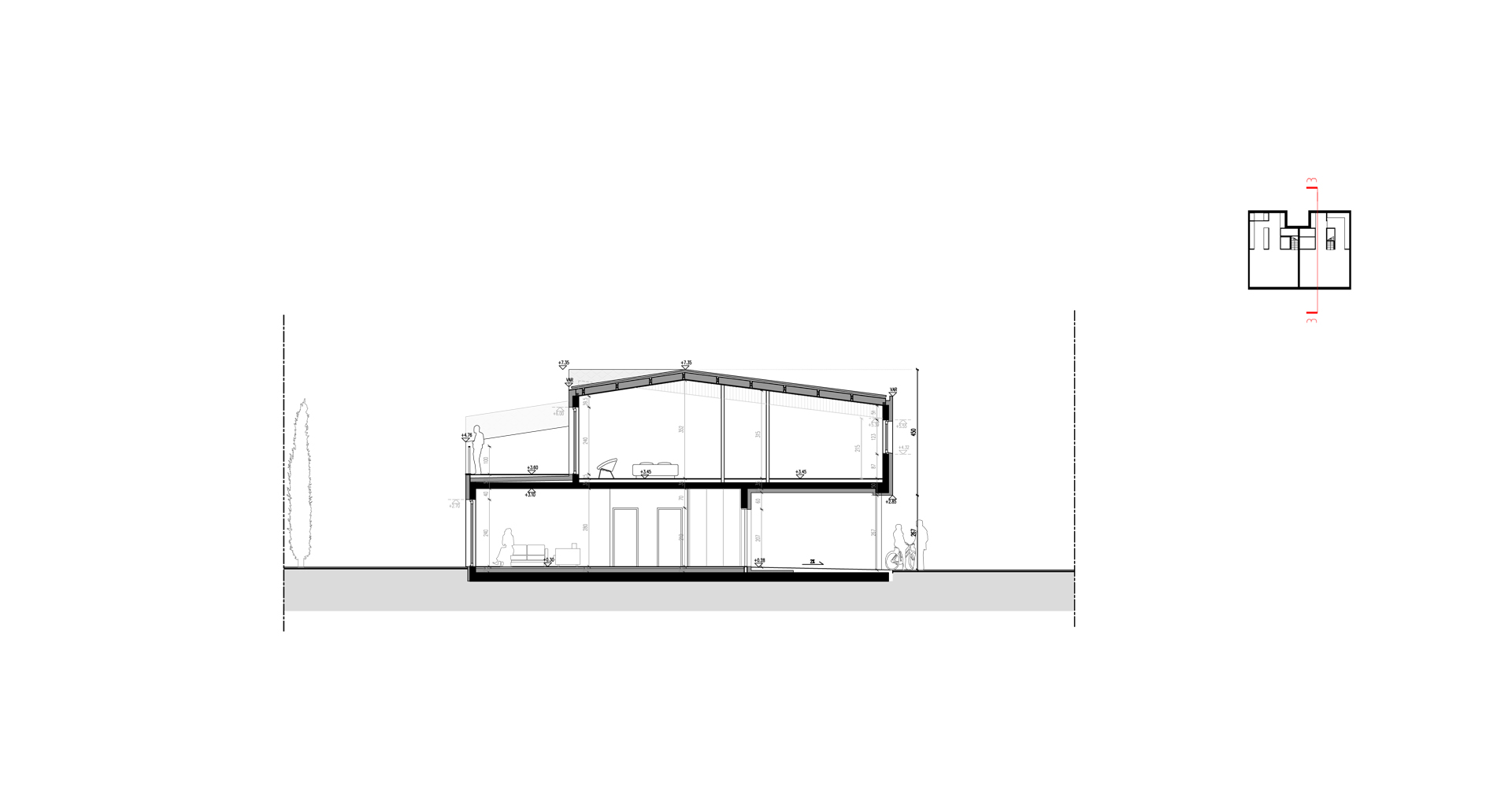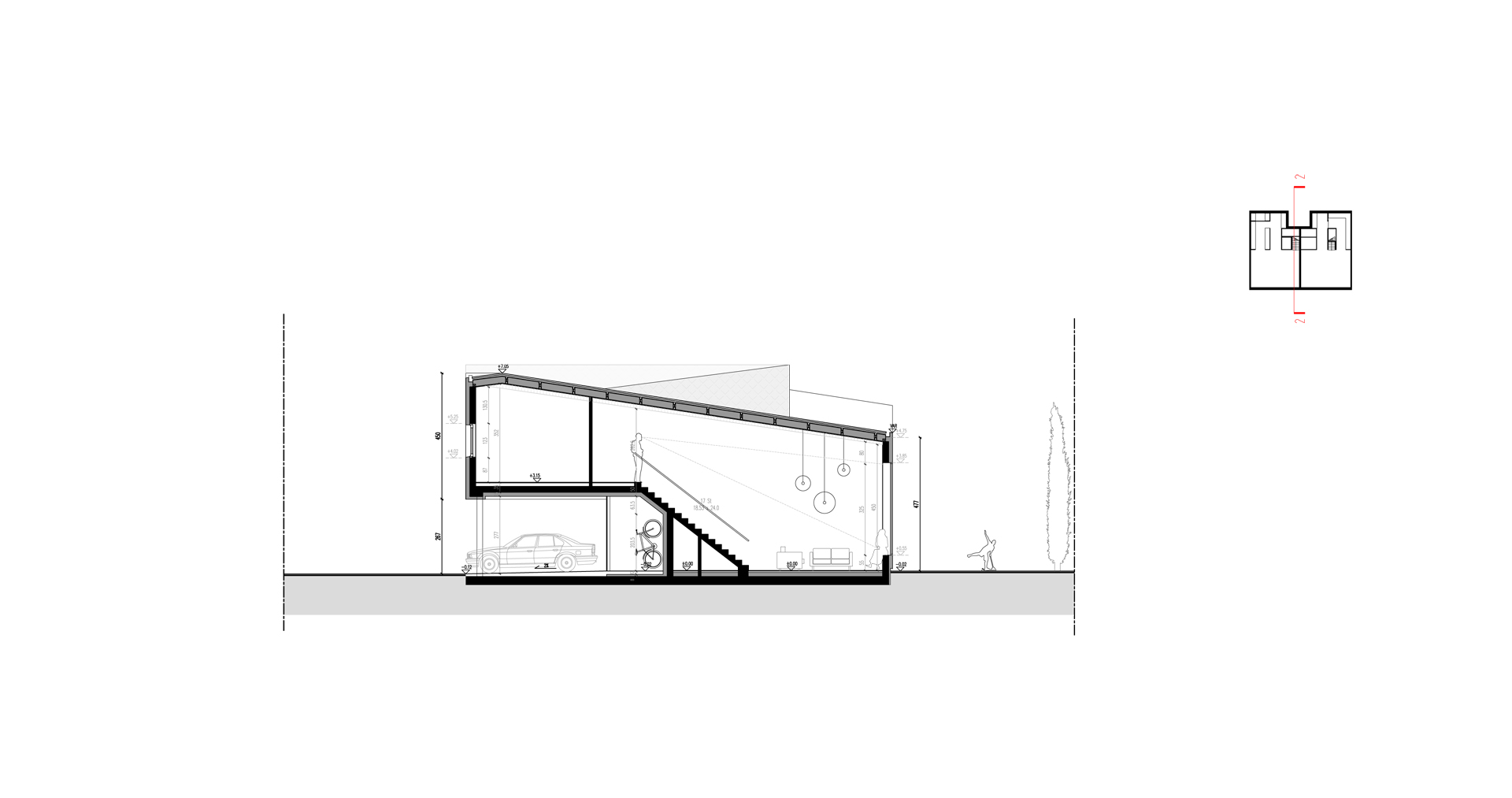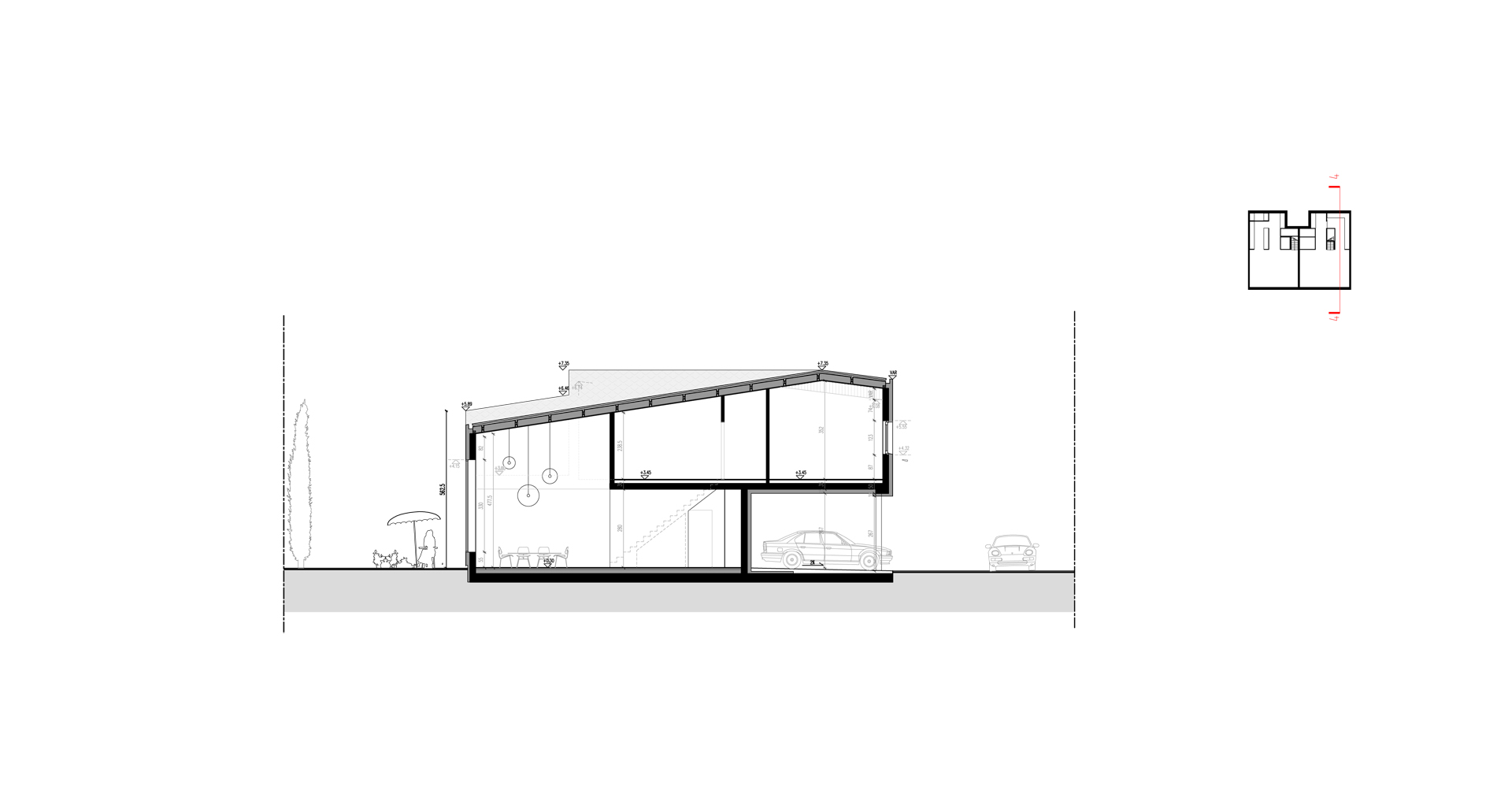 Dzięki nietypowej formie dachu, budynek zarówno z zewnątrz jak i wewnątrz jest bardzo dynamiczny. Wysokość zmienia się, zacieśnia by znów uwolnić nas w przestrzeni salonu. Strefa jadalni wyposażona została w wielkie 3,5m przeszklenie, które sprawia, że światło wpływa do całego mieszkania.