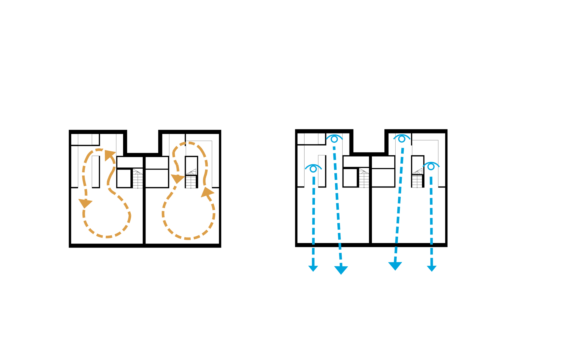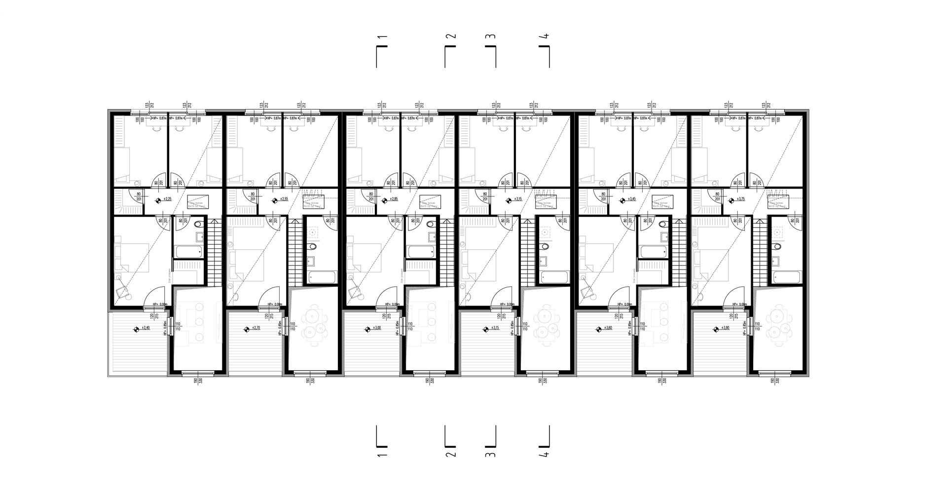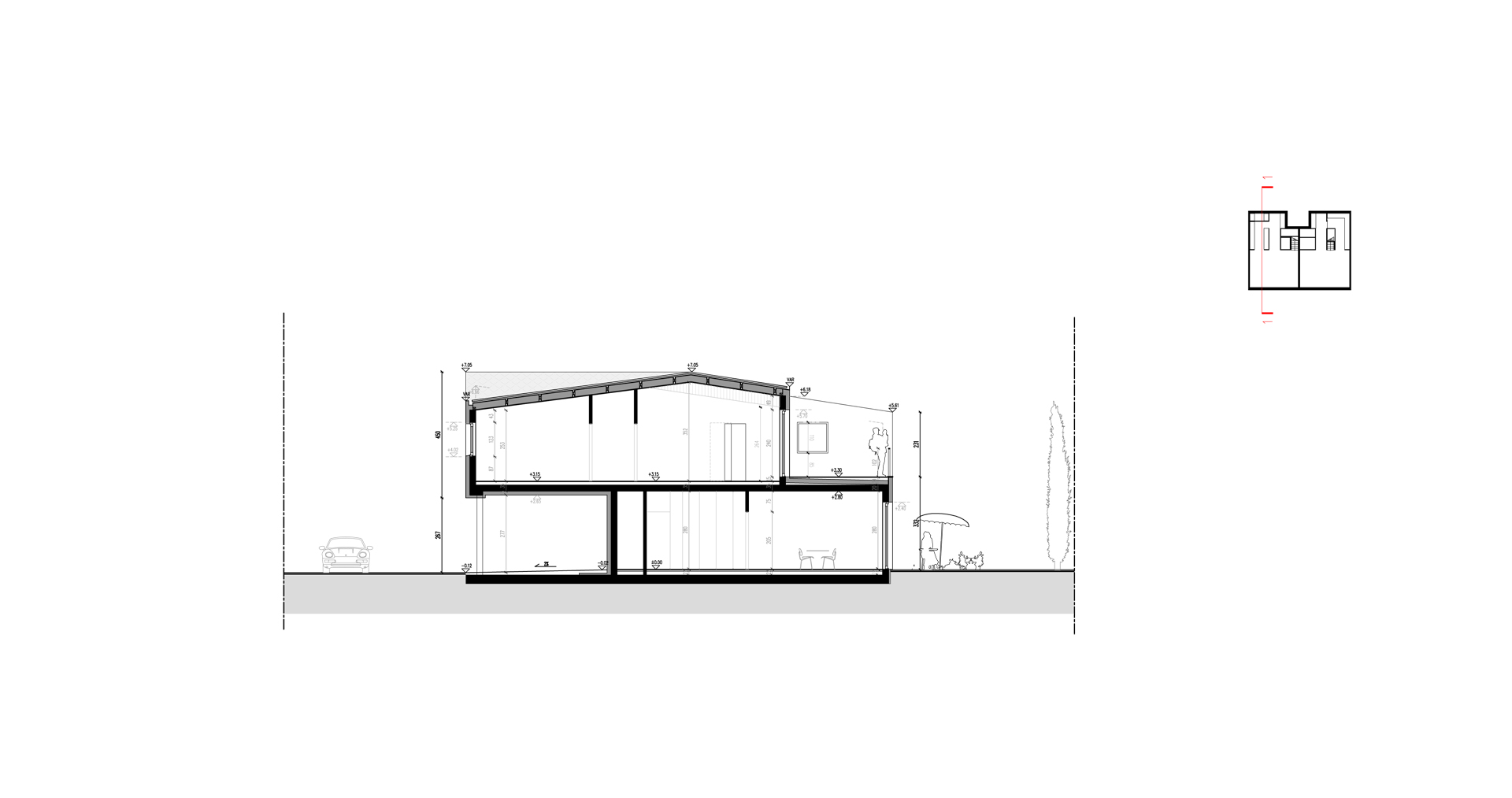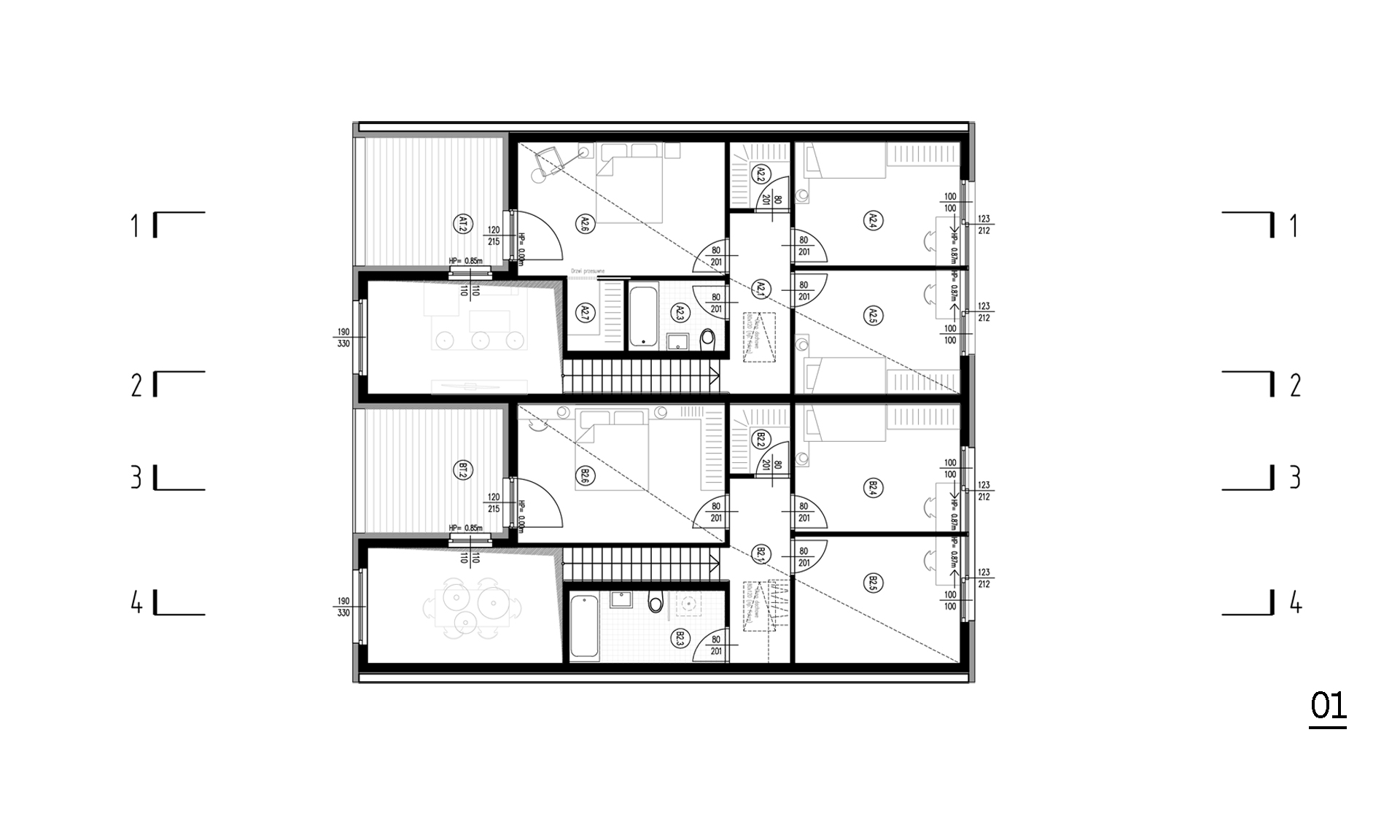 Dzięki nietypowej formie dachu, budynek zarówno z zewnątrz jak i wewnątrz jest bardzo dynamiczny. Wysokość zmienia się, zacieśnia by znów uwolnić nas w przestrzeni salonu. Strefa jadalni wyposażona została w wielkie 3,5m przeszklenie, które sprawia, że światło wpływa do całego mieszkania.