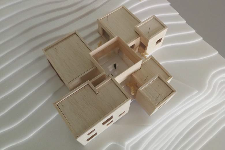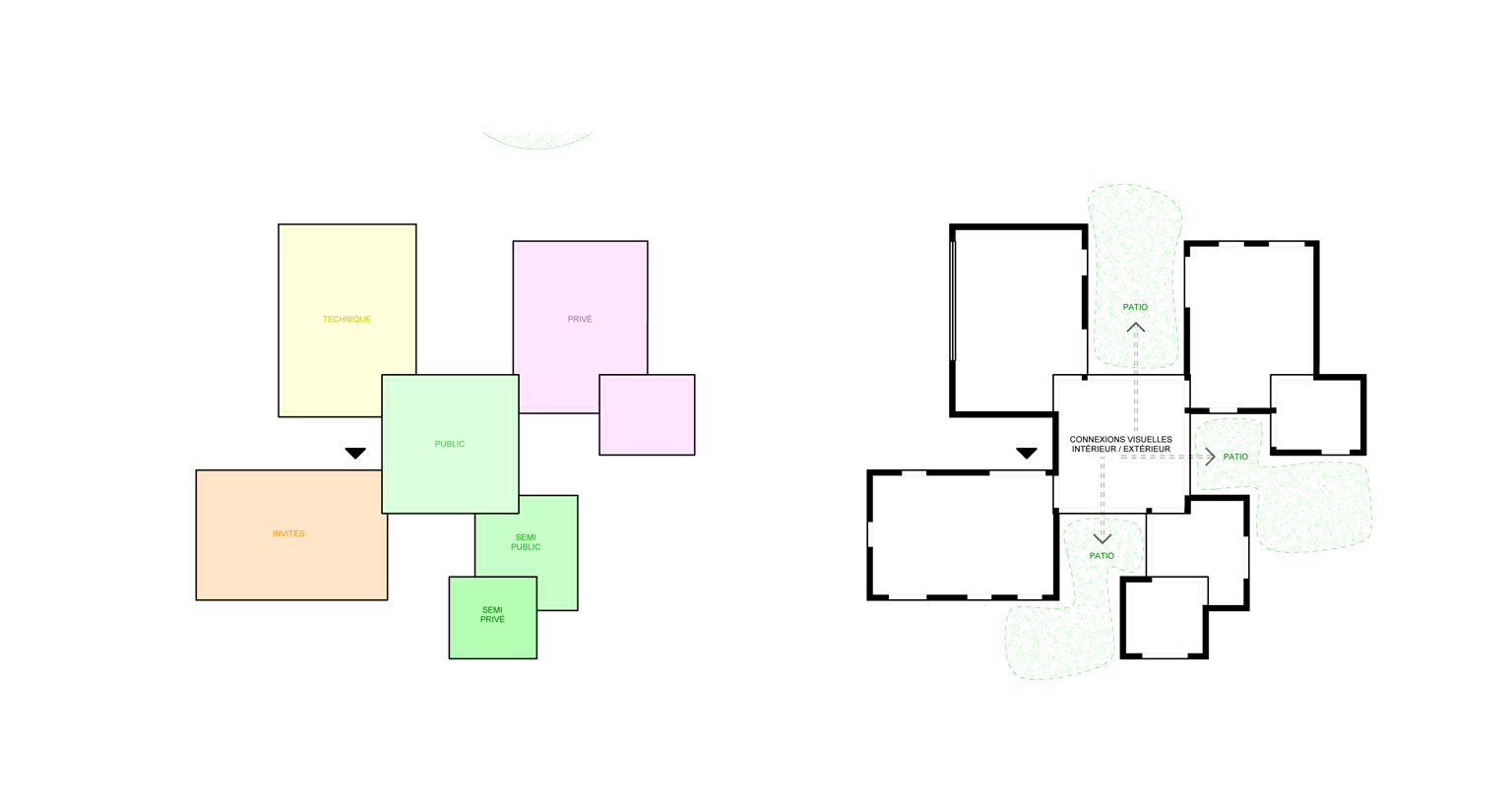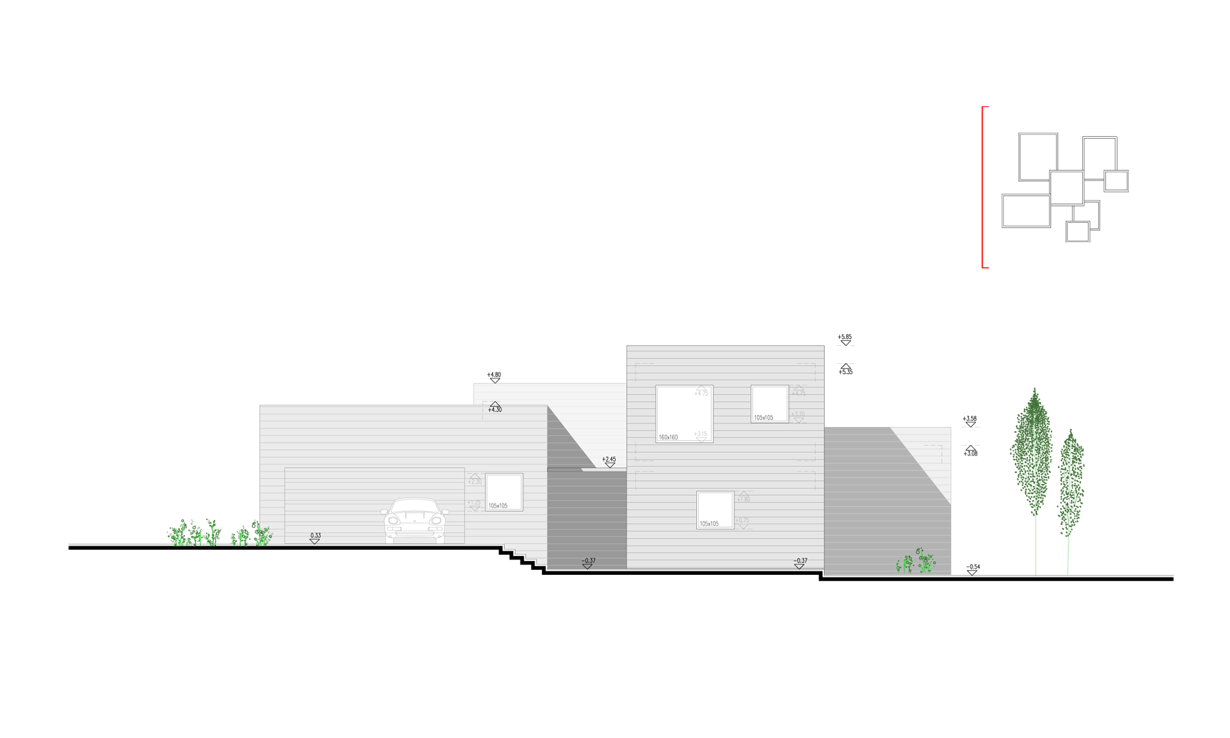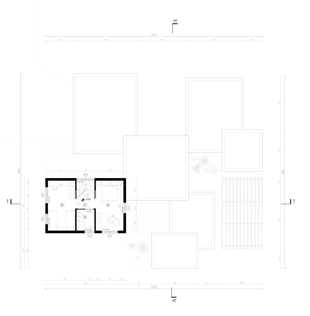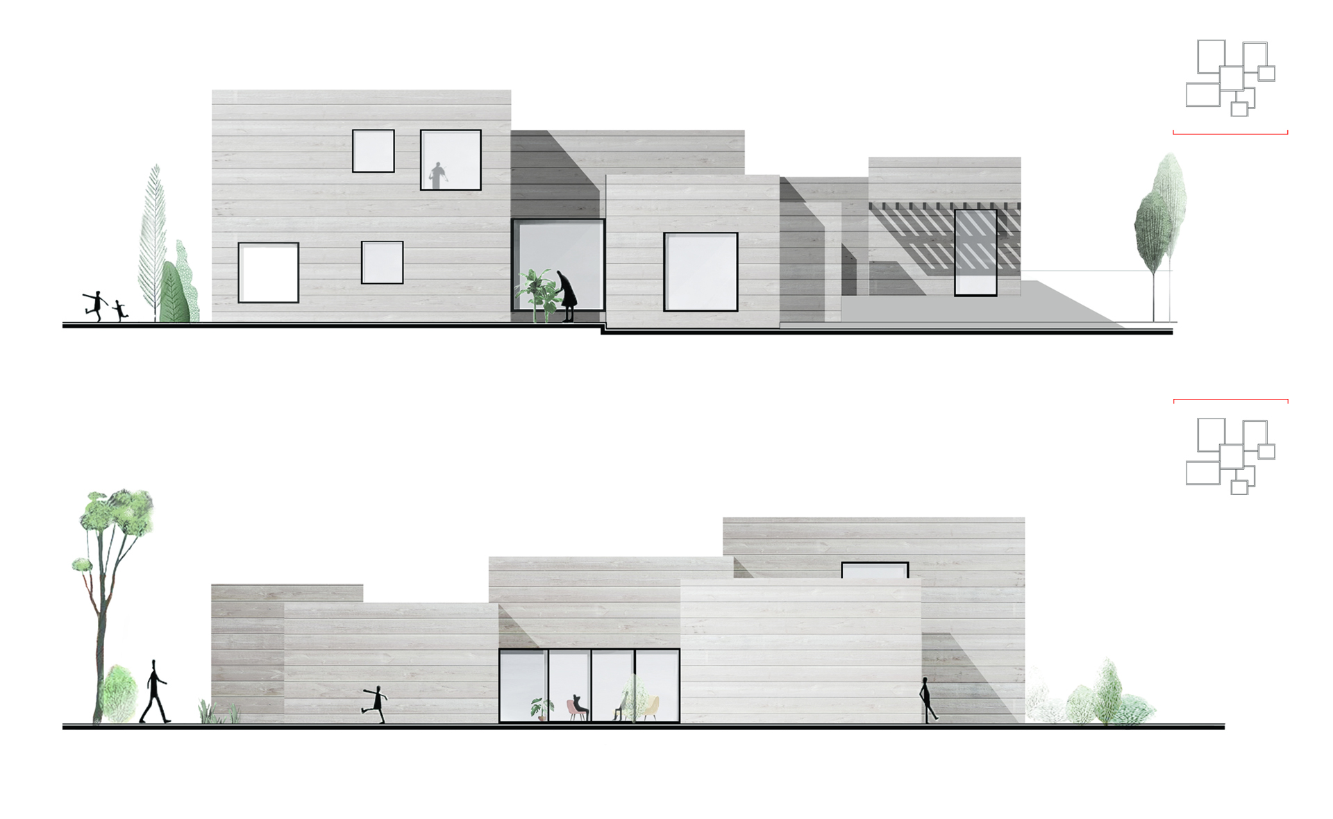 Funkcje zostały jasno podzielone, a każda z nich stanowi osobną bryłę. Elementy nachodzą i przenikają się tworząc całość. Cześć centralną i człon spinający wszystkie funkcje stanowi salon. Z niego mamy dostęp do każdego pomieszczenia. Projekt zapewnia niezależność i prywatność funkcji.