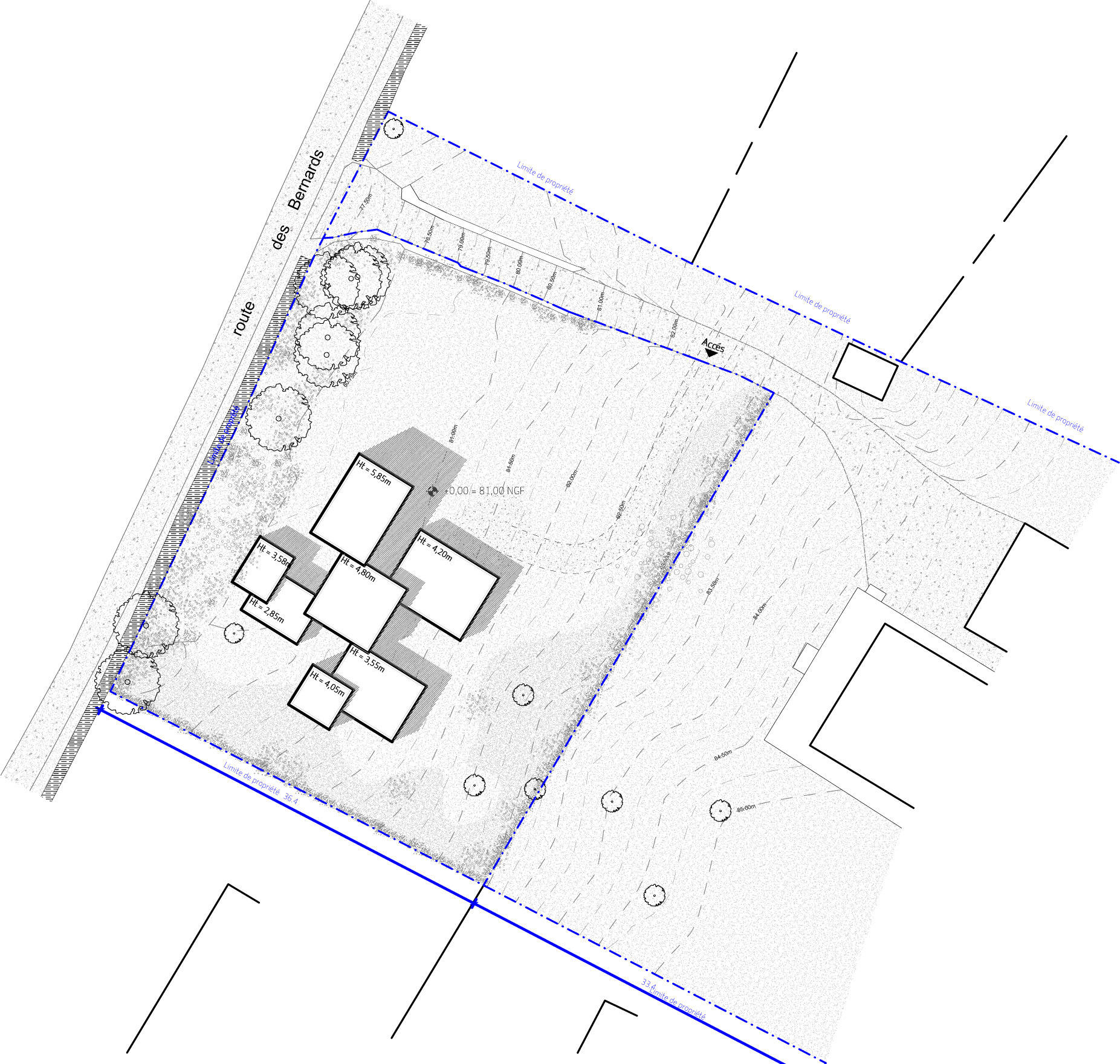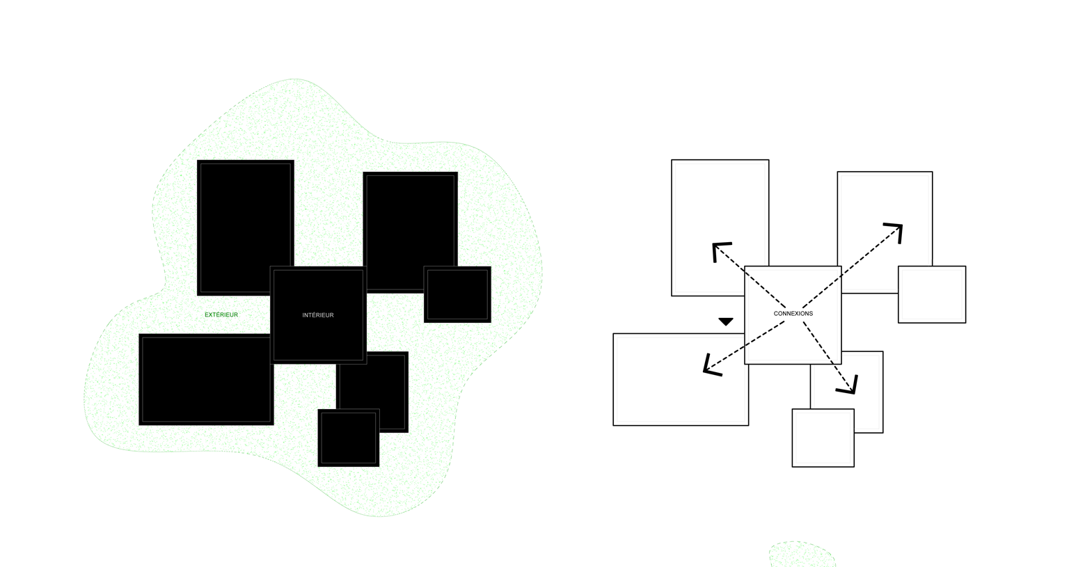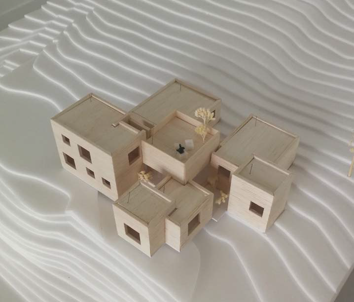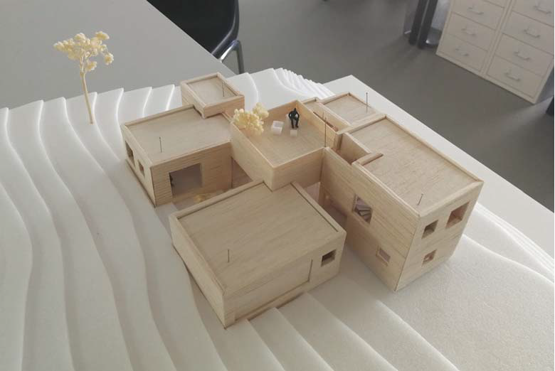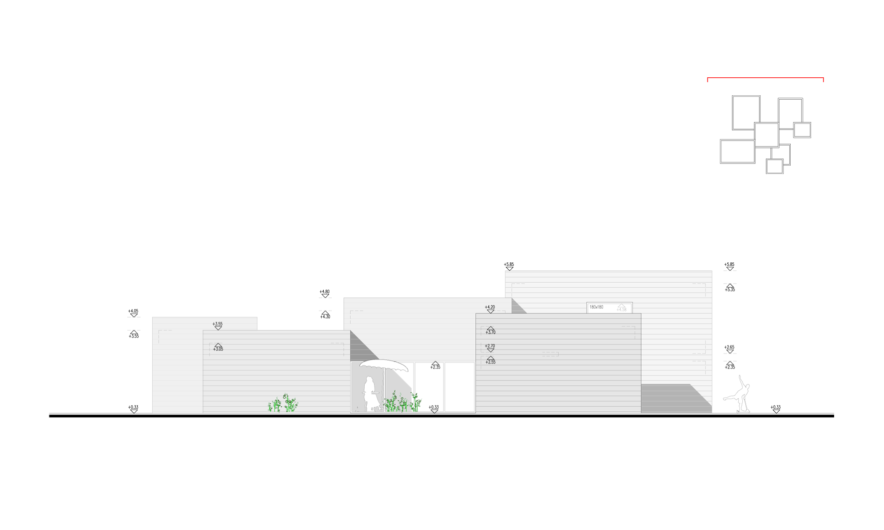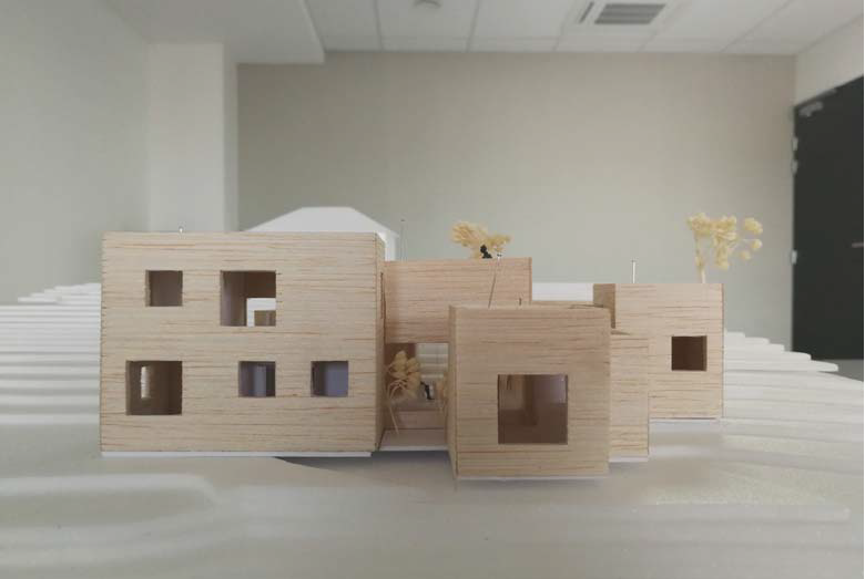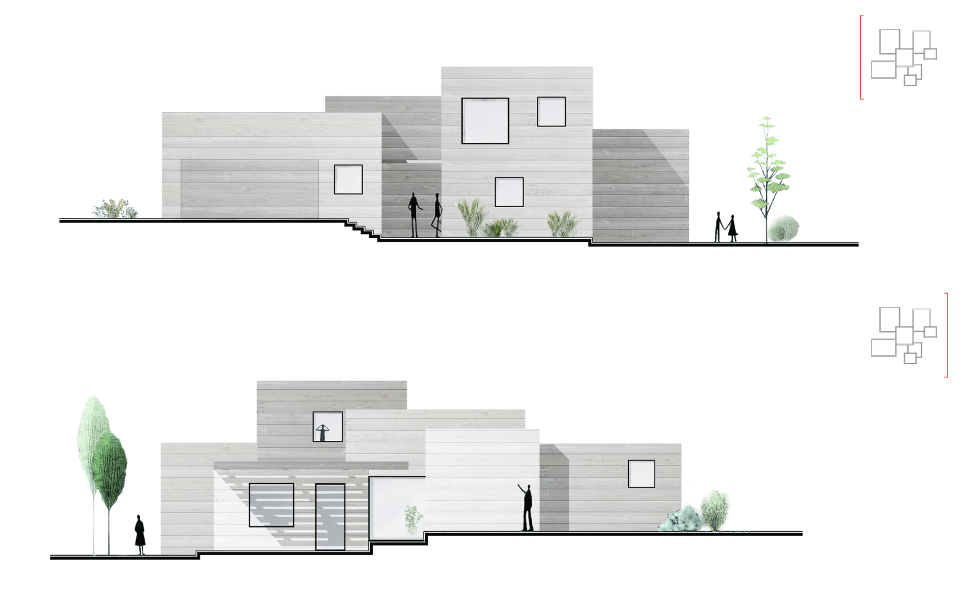 Funkcje zostały jasno podzielone, a każda z nich stanowi osobną bryłę. Elementy nachodzą i przenikają się tworząc całość. Cześć centralną i człon spinający wszystkie funkcje stanowi salon. Z niego mamy dostęp do każdego pomieszczenia. Projekt zapewnia niezależność i prywatność funkcji.
